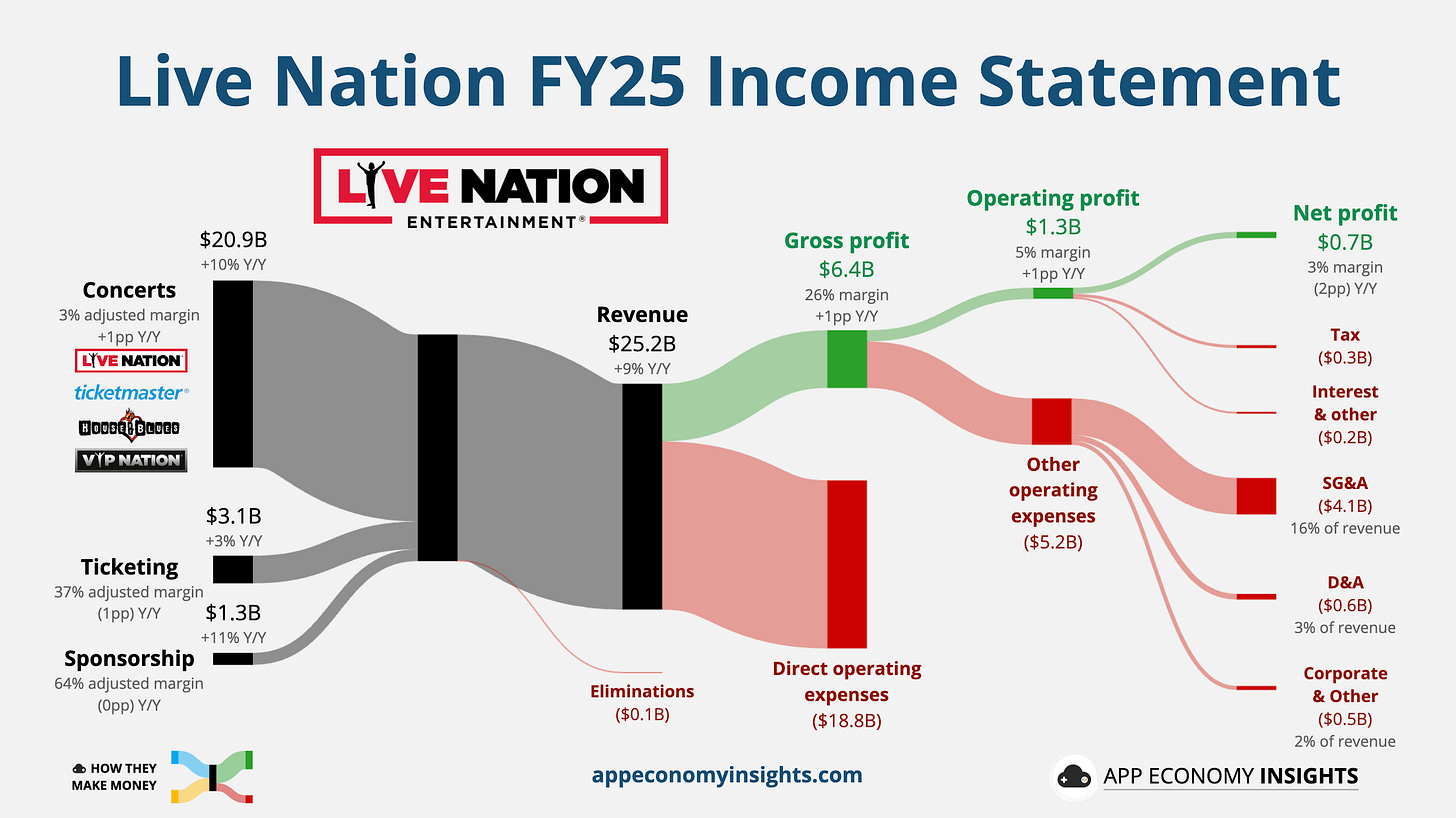 One detail jumps out in how Live Nation makes money. Despite dominating the live events ecosystem, Live Nation’s profits remain surprisingly thin. The company generated $25.2 billion in revenue but only $0.7 billion in net income in FY25, a net margin of just 3%.