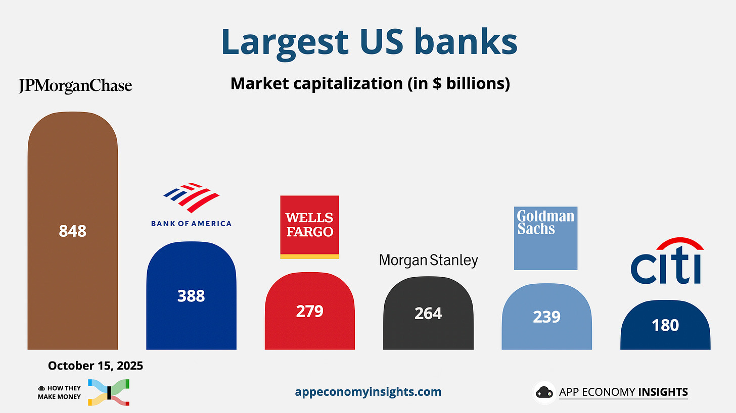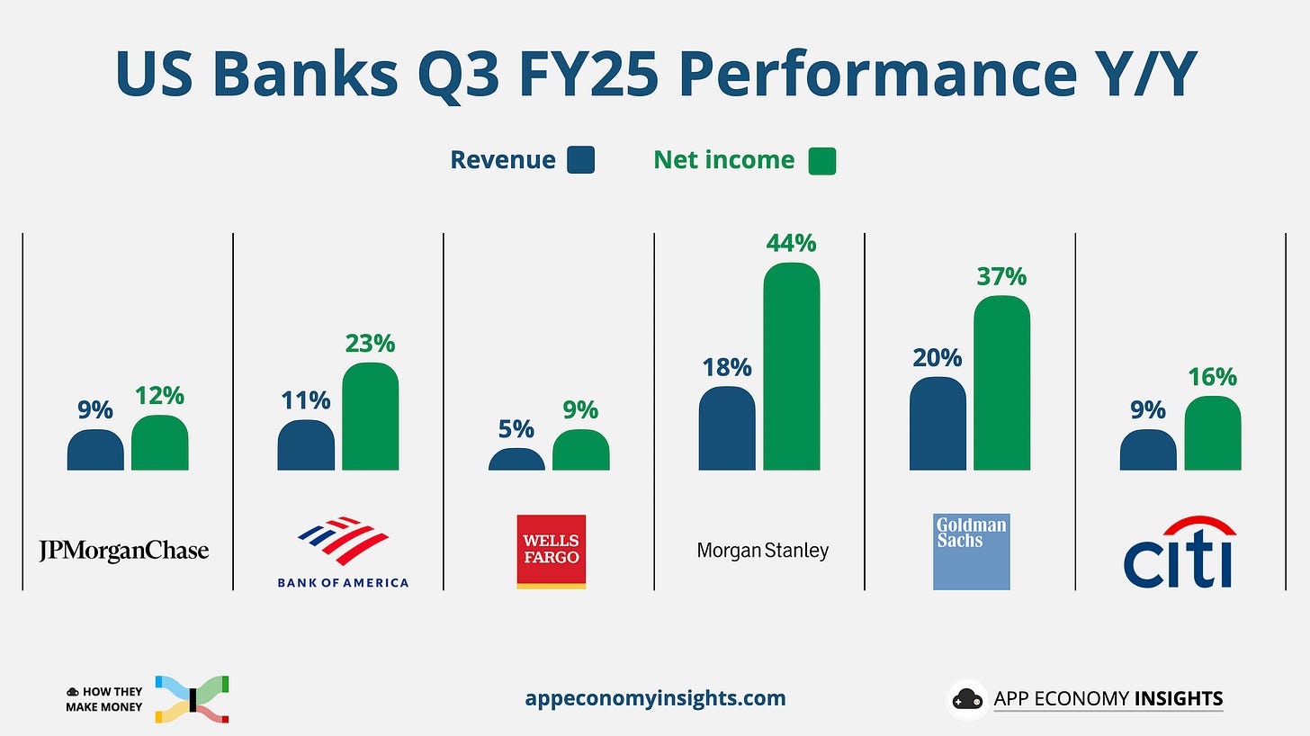 💼 Wealth steps into the spotlight: Rising stock markets gave wealth units a lift across the board. Client assets rose by double-digits at JPMorgan, Morgan Stanley, and Citi. It’s a clear sign that the push to diversify beyond lending into steadier, fee-based revenue is paying off.
