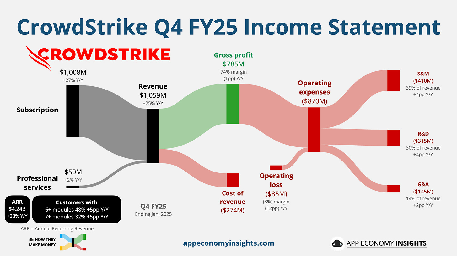 Impressive quarter, but weak guidance. CrowdStrike delivered large beats on the top and bottom line for Q4 FY25. But guidance was the sticking pointânext quarterâs earnings forecast came in well below expectations, leading to a sell-off. The profitability miss in FY26 was primarily due to sales & marketing costs associated with the CCP and amortized over a year.