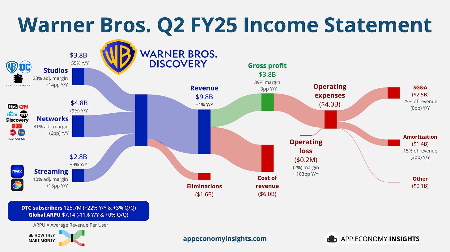 📈 More subscribers at a lower price: The “re-rebranded” HBO Max and Discovery+ added 3.4 million subscribers in Q2, reaching 126 million globally, above expectations. Streaming revenue rose 9% to $2.8 billion, and adjusted EBITDA flipped to a $293 million profit from a loss a year ago. However, ARPU fell 11% globally (-8% in the US), as growth skewed international and ad-tier wholesale deals weighed on pricing. Management remains confident in hitting $1.3 billion streaming EBITDA by 2025 and 150 million subs by 2026.