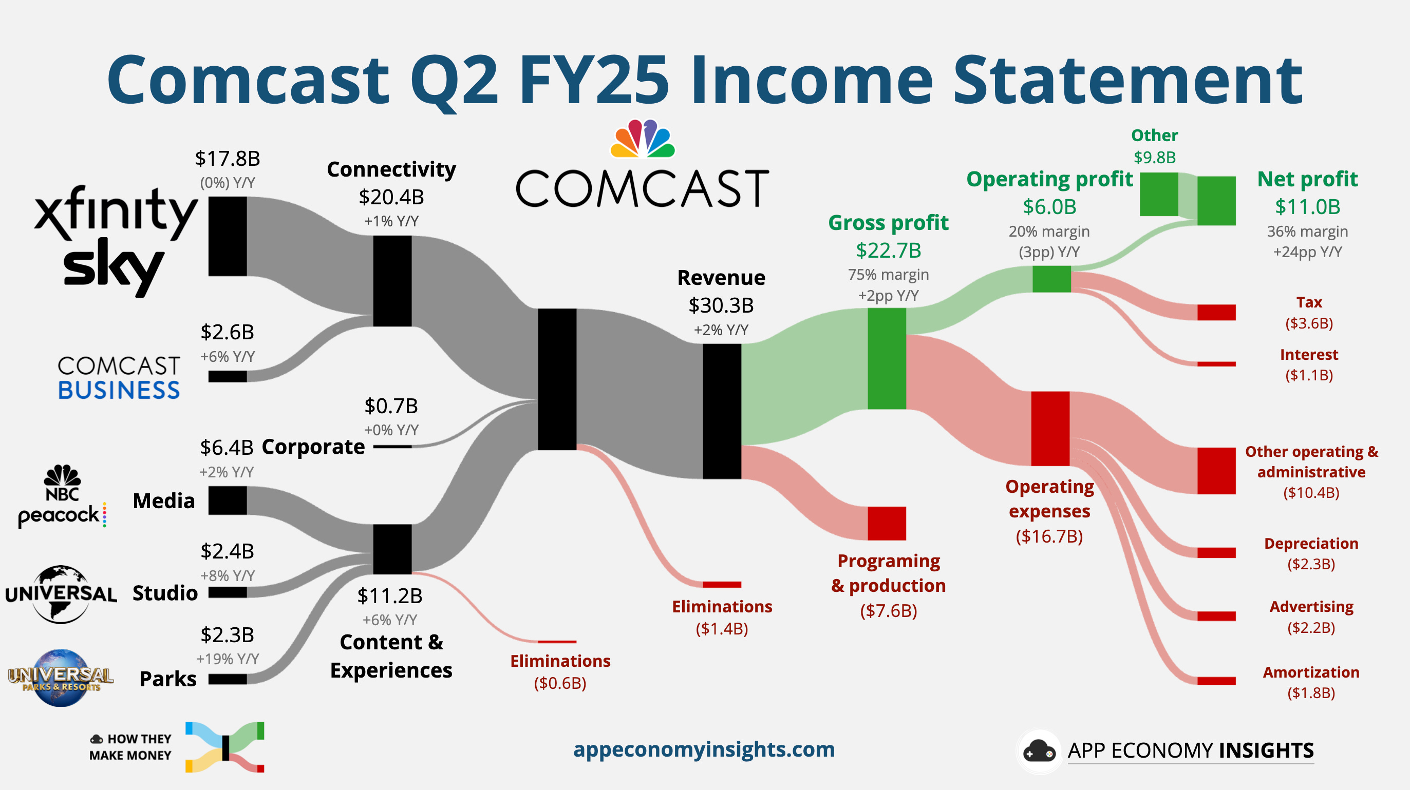 📉 Subscriber losses widen: Comcast lost 226,000 broadband customers in Q2, deeper than Q1’s 199,000 losses but better than the 257,000 analysts expected. Pay-TV losses also eased slightly to 325,000 versus 383,000 expected. Wireless was a standout, adding a record 378,000 lines. Connectivity and platforms revenue was slightly up at $20.4 billion, supported by new pricing guarantees and bundled offers.