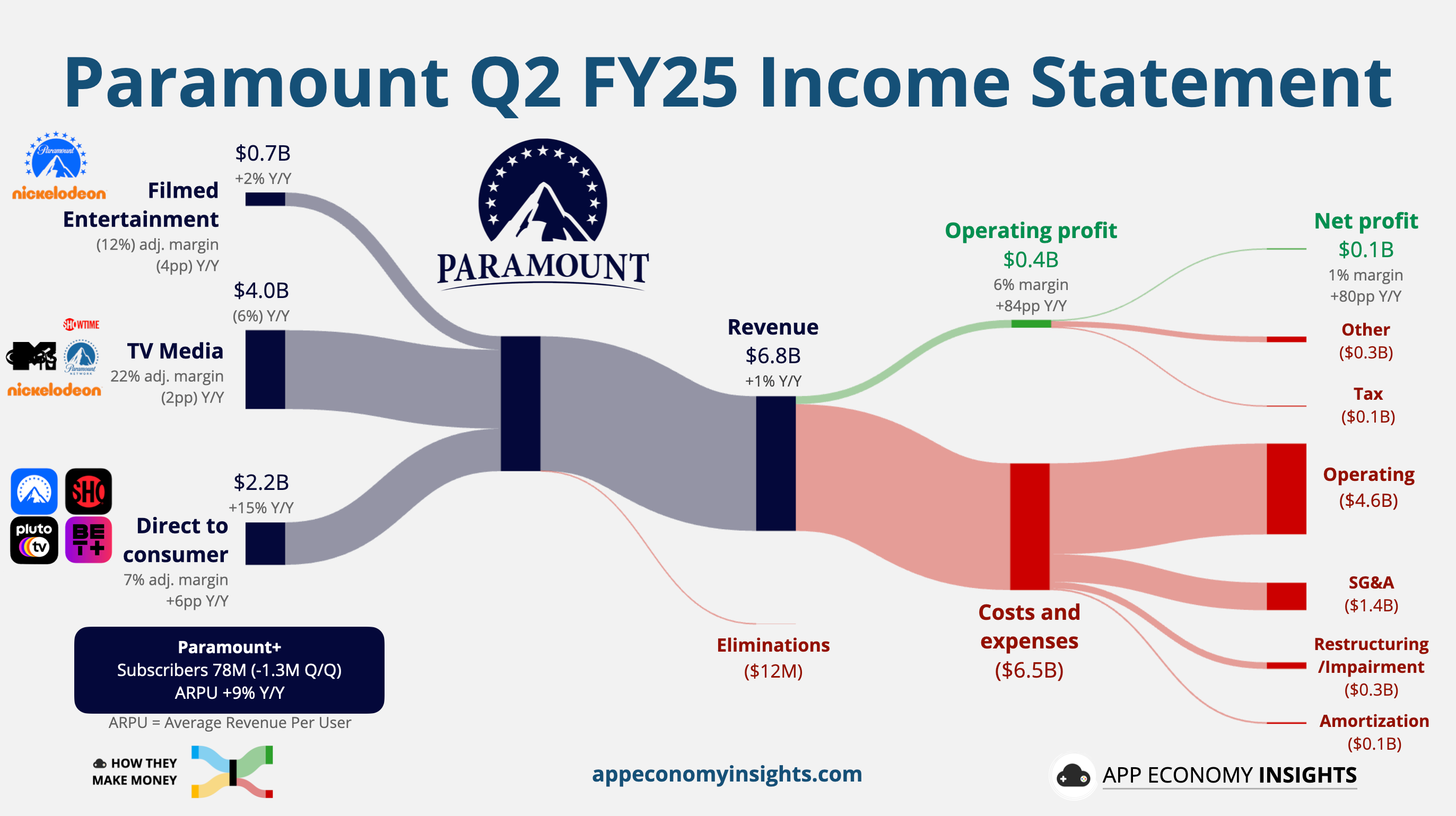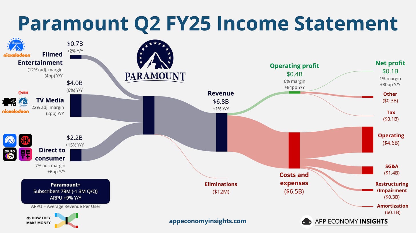 🎥 Film division rebounds: Filmed entertainment revenue grew 2% to $690 million, led by an 84% jump in theatrical revenue from Mission Impossible: The Final Reckoning, offset by a decline in licensing due to weaker animated content. Franchise strength is boosting library viewership across Paramount+, though the segment posted an $84 million loss amid rising production costs.
