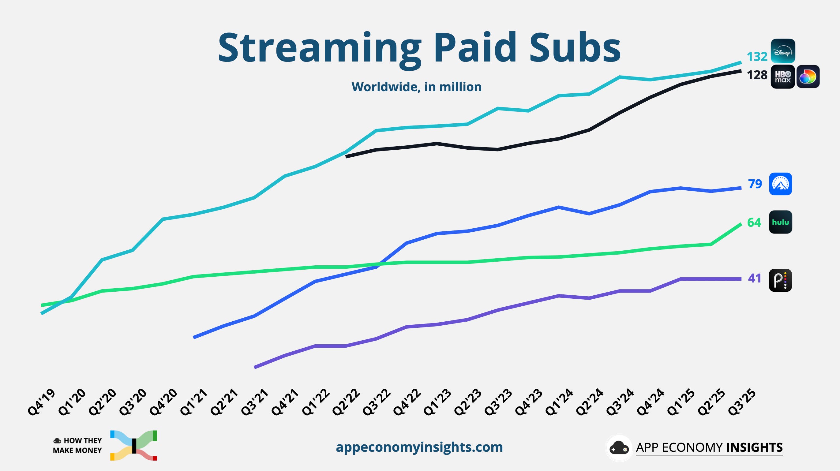 Of course, the outlier here is Hulu, jumping from 55 million to 64 million in the September quarter. It was almost entirely driven by distribution-led gains rather than organic standalone growth. Disney expanded its Charter bundle footprint during the quarter, pulling millions of households into Huluâs subscriber count even if they never actively signed up for the service.
