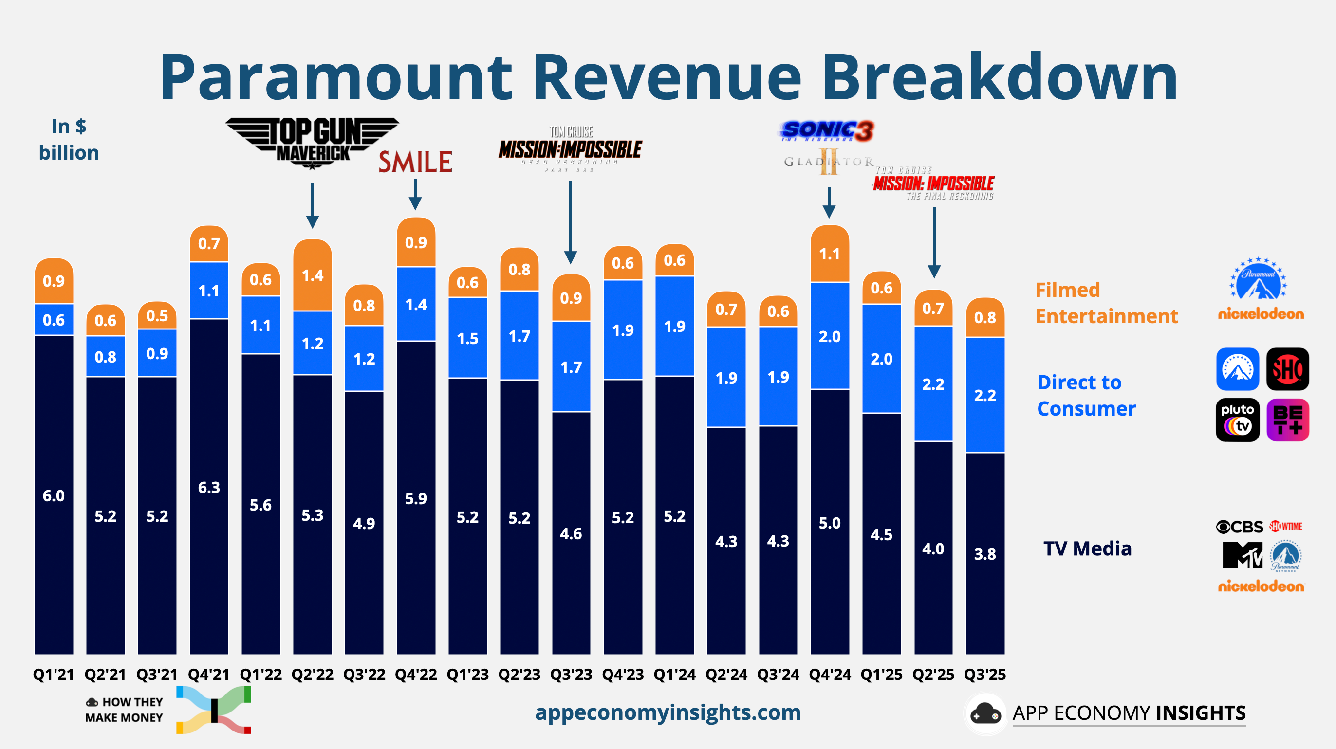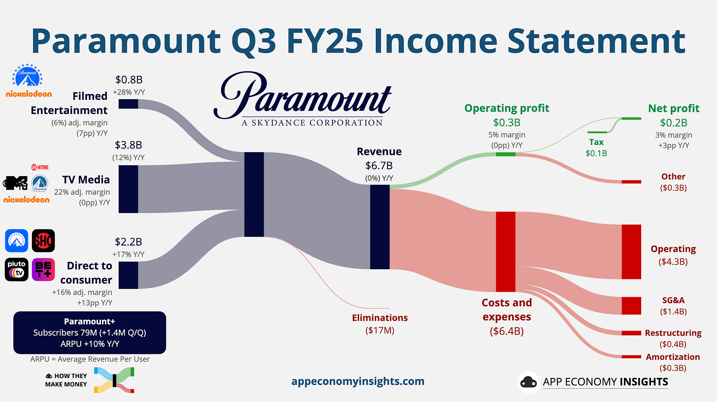 đŹ Studio stumbles: The Filmed Entertainment segment swung to a loss of $49 million. Revenue grew 30% to $756 million, but this was attributed to consolidating Skydanceâs licensing. The theatrical slate underperformed, with films like Smurfs and The Naked Gun cited as disappointments.