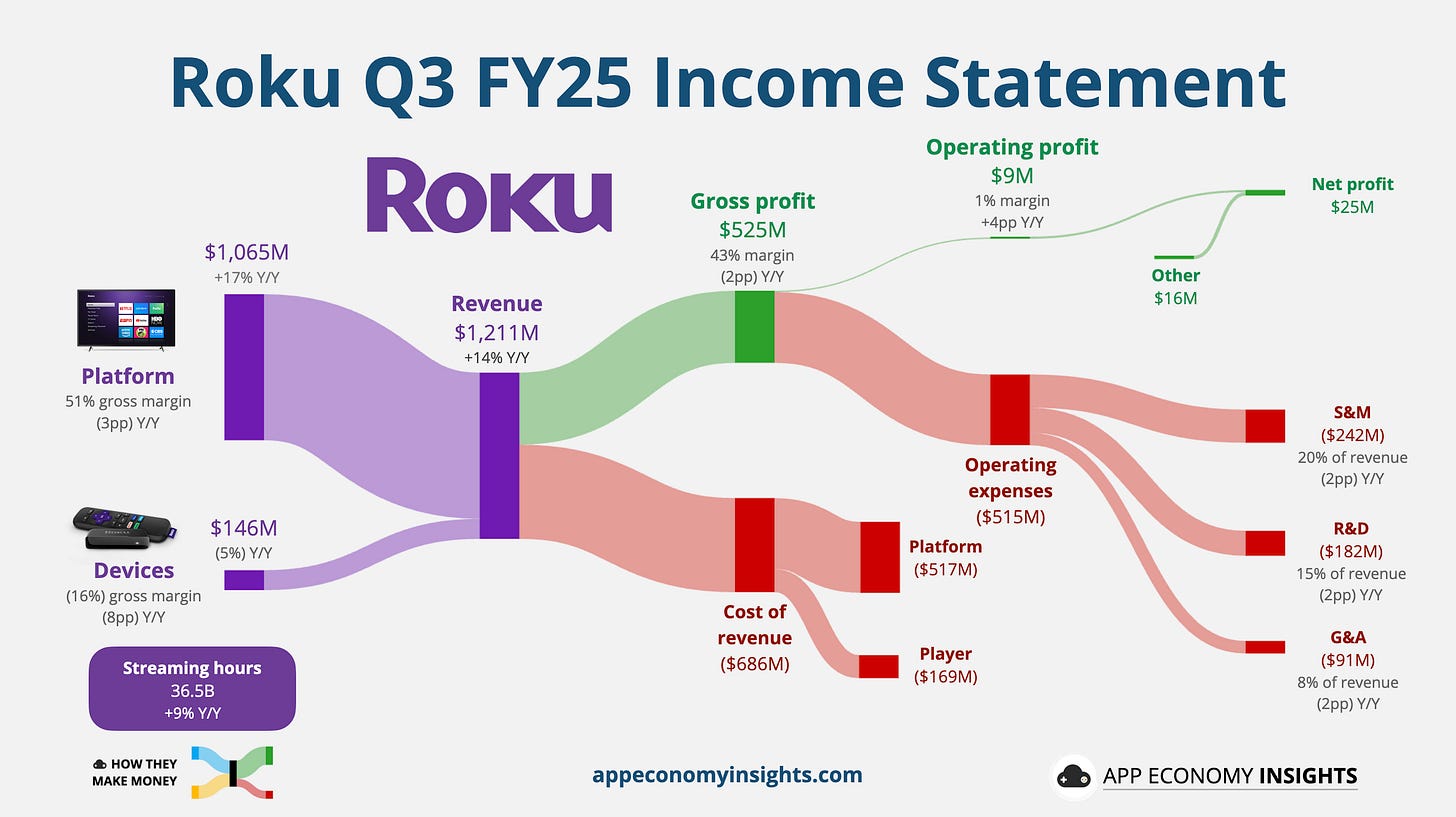 đž Big picture: Roku reported a massive Q3 earnings beat and strong guidance, causing the stock to rally. Total revenue grew 14% Y/Y to $1.21 billion (in line with estimates), but the company posted a surprise profit of $0.16 per share ($0.07 beat). Roku also achieved its first positive operating income since 2021, generating $25 million in net income (from last yearâs $9 million loss).