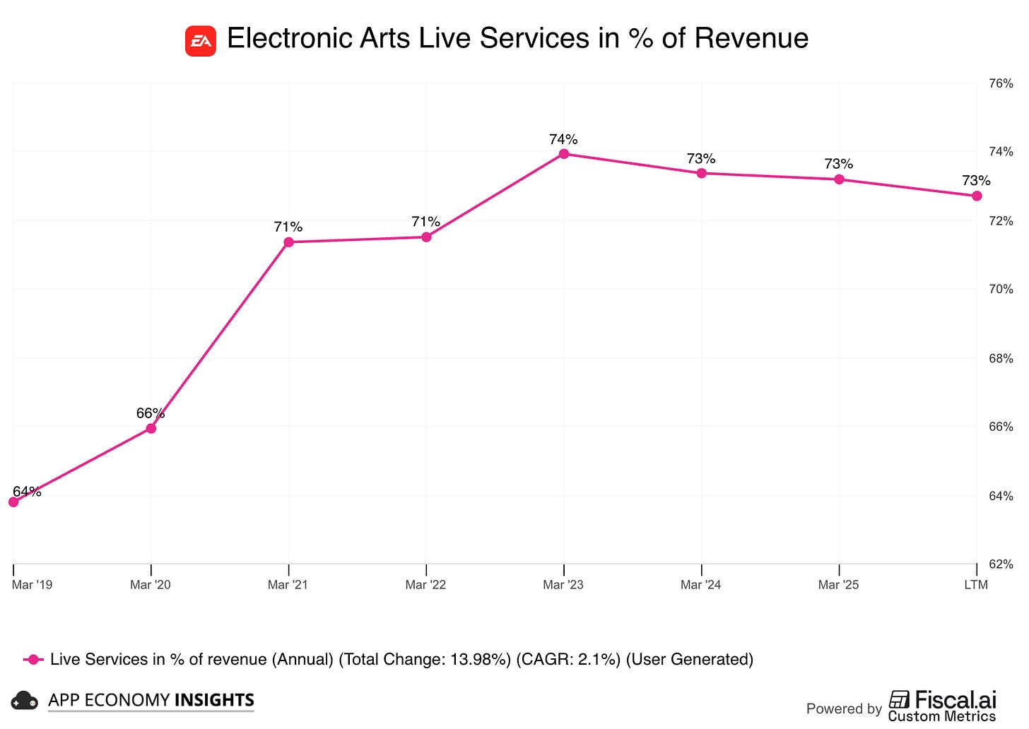 Think products like Ultimate Teamâstyle modes, microtransactions, subscriptions. They made up 73% of the overall revenue in the past 12 months, up from 64% in FY19 (ending in March).