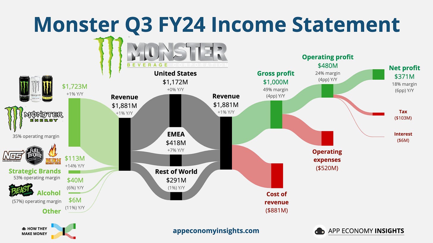 In the most recent quarter, Monster faced weaker consumer demand, with its alcohol brands underperforming. Excluding alcohol and adjusted for currency headwinds, revenue grew 5% in Q3.