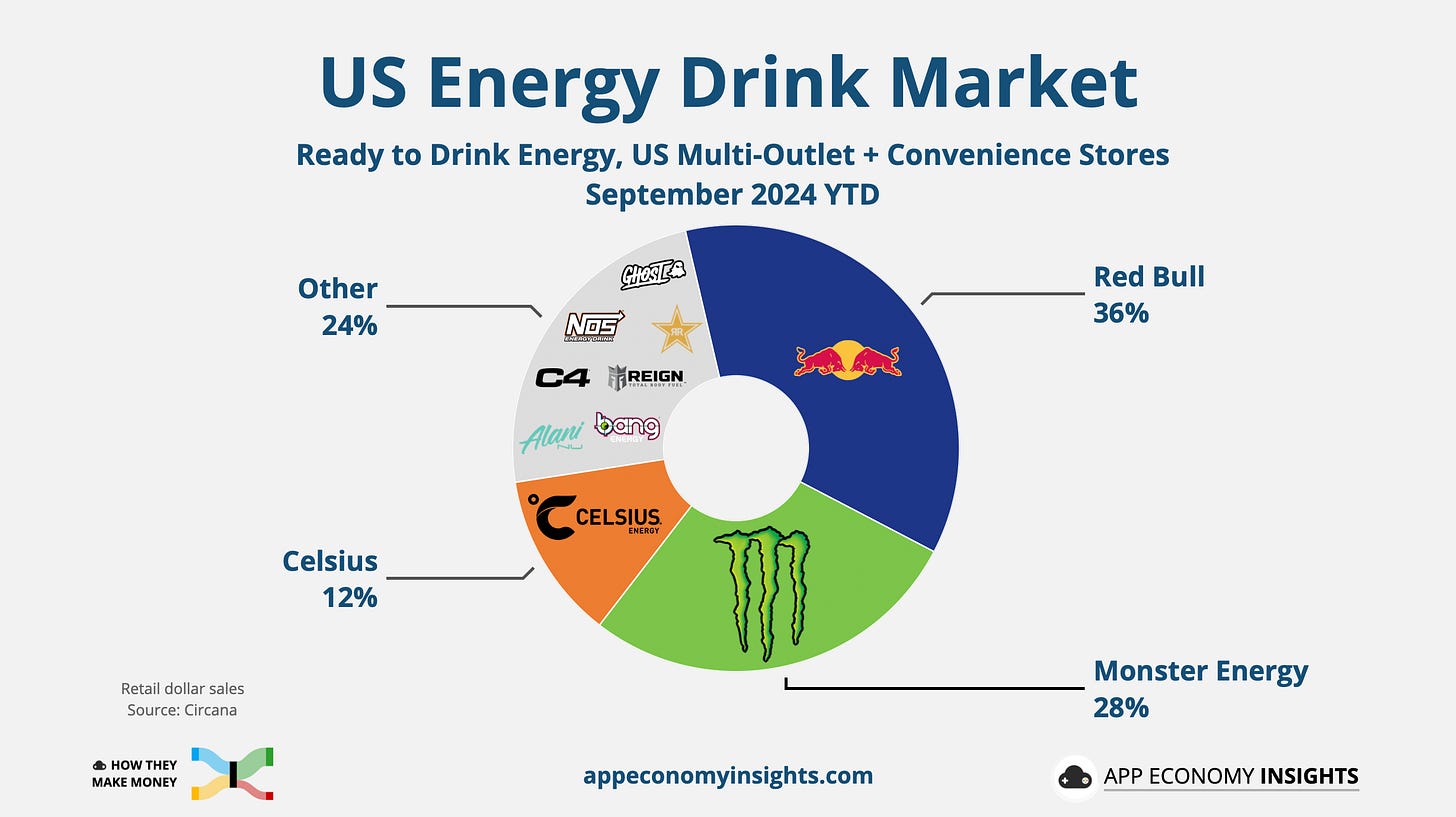 Red Bull: Credited with pioneering the energy drink category, the Austrian giant is still private. It maintains a stronghold on market share with premium positioning, accounting for 36% of the US energy drink market.