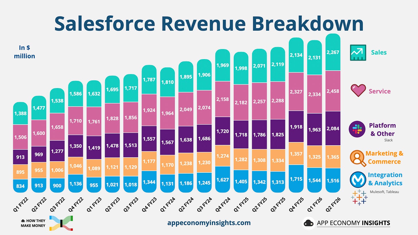 While Platform (including Slack) and Integration & Analytics (MuleSoft, Tableau) remain the fastest-growing segments, the more mature clouds have slowed to single-digit growth.