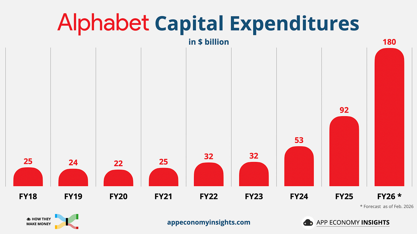 CapEx ramp: Alphabet plans to spend up to $185 billion in CapEx in FY26, effectively doubling its 2025 level. The company is plowing back nearly every dollar generated by its existing operations into the AI race. While OpenAI and Anthropic are perpetually one down-round or one failed capital raise away from a crisis, Alphabet is funding the most expensive infrastructure build-out in history entirely through its own cash flows.