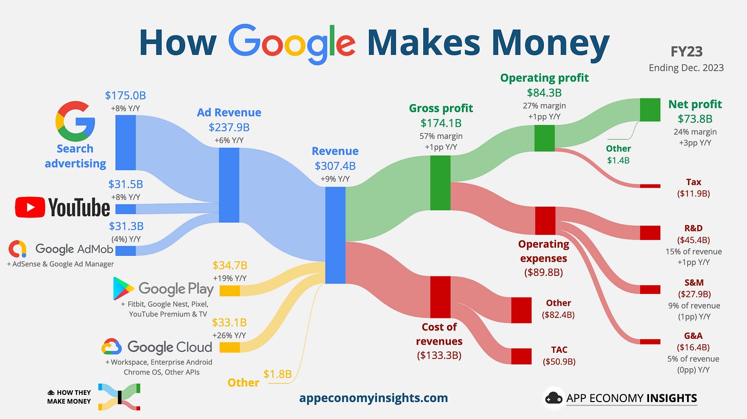 According to court documents, Alphabet paid distribution partners $26 billion as a search revenue share in FY21. Turning to FY23, assuming 70% of Network revenue went to partners (roughly $22 billion), that leaves us with roughly $29 billion spent in TAC for search alone last year.