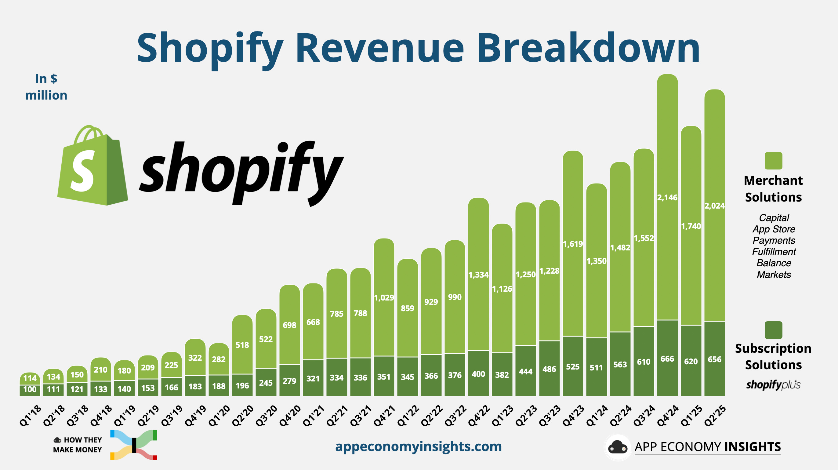 Look no further than Shopify to see this trend in action. As one of the highlights of this earnings season, Shopify saw both its GMV and revenue accelerate to 31% Y/Y growth in Q2, as the company goes upmarket and expands internationally. Merchant Solutions, with services like Shopify Payments, has been the real growth engine.
