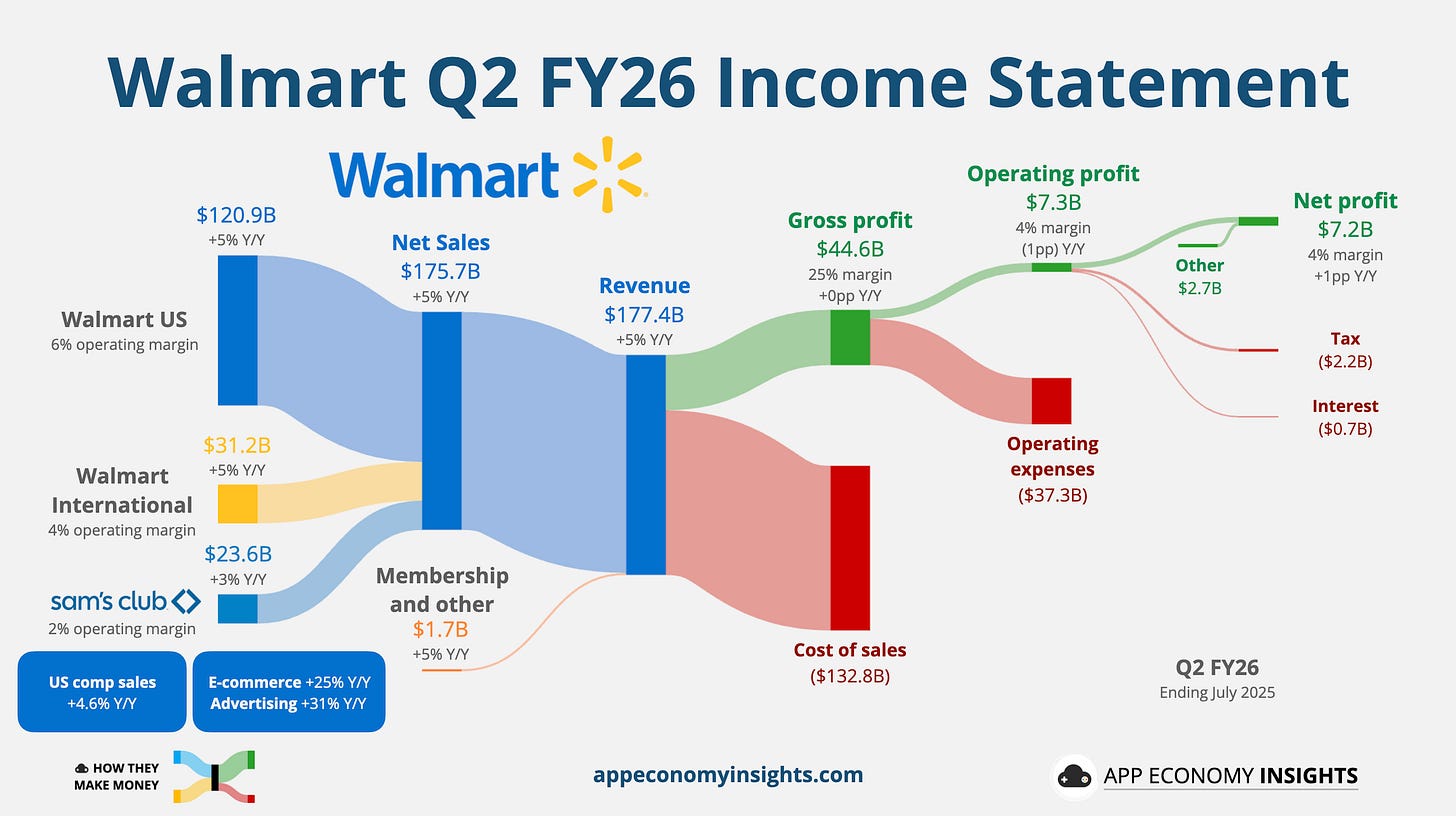 📈 E-commerce surge: Revenue rose 5% Y/Y to $177.4 billion ($3 billion beat). US comparable sales rose 4.6%, outpacing most big-box peers. Global e-commerce climbed 25%.