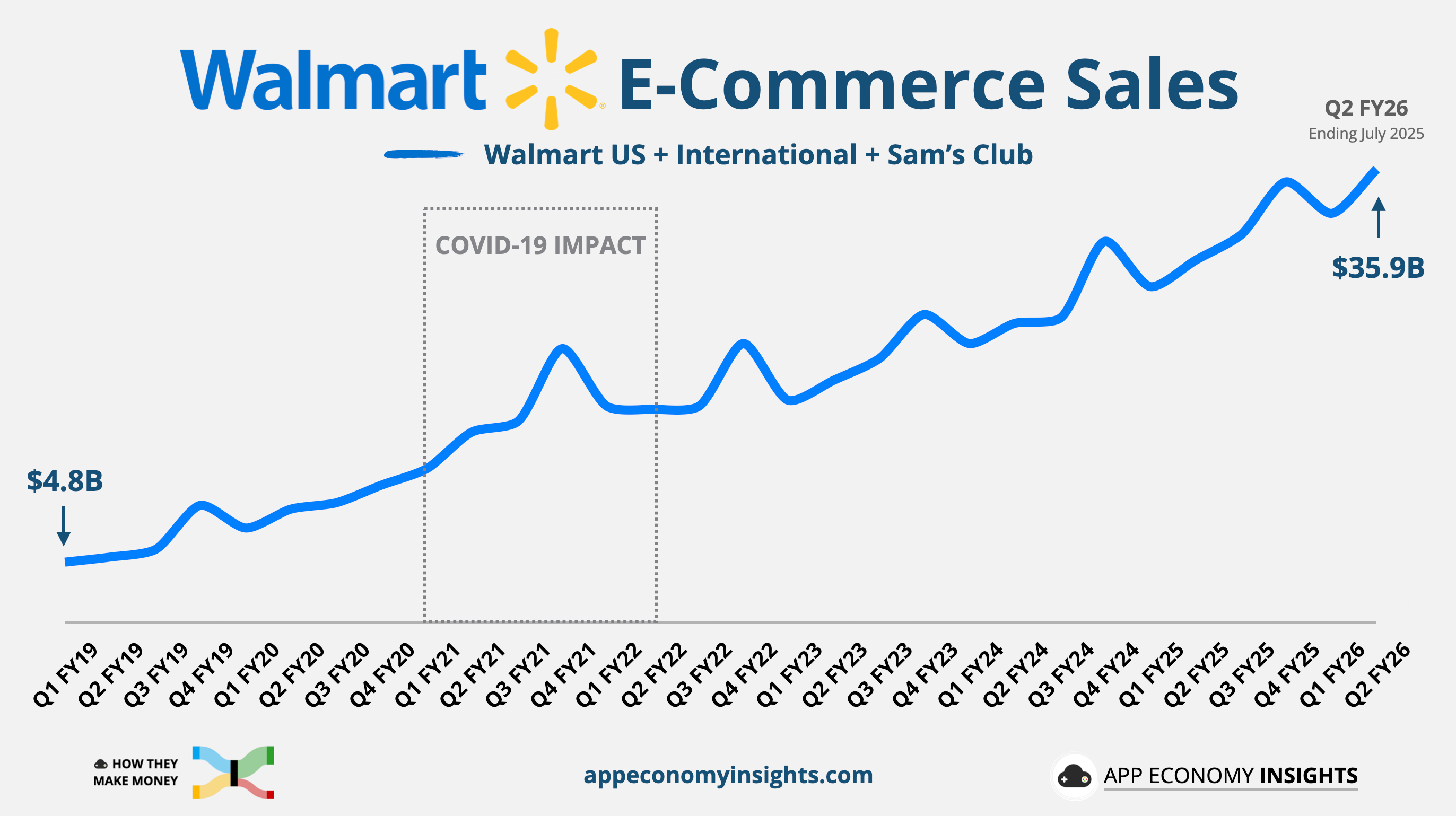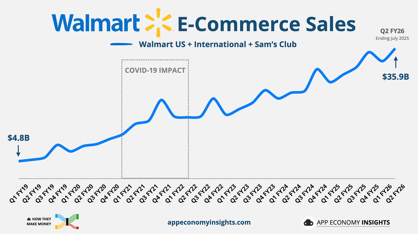 Walmart’s e-commerce revenue has surged roughly 7× in 7 years, a growth reminiscent of Amazon’s rise in popularity in the late 2010s. The COVID spike reset the baseline higher, and growth has continued.