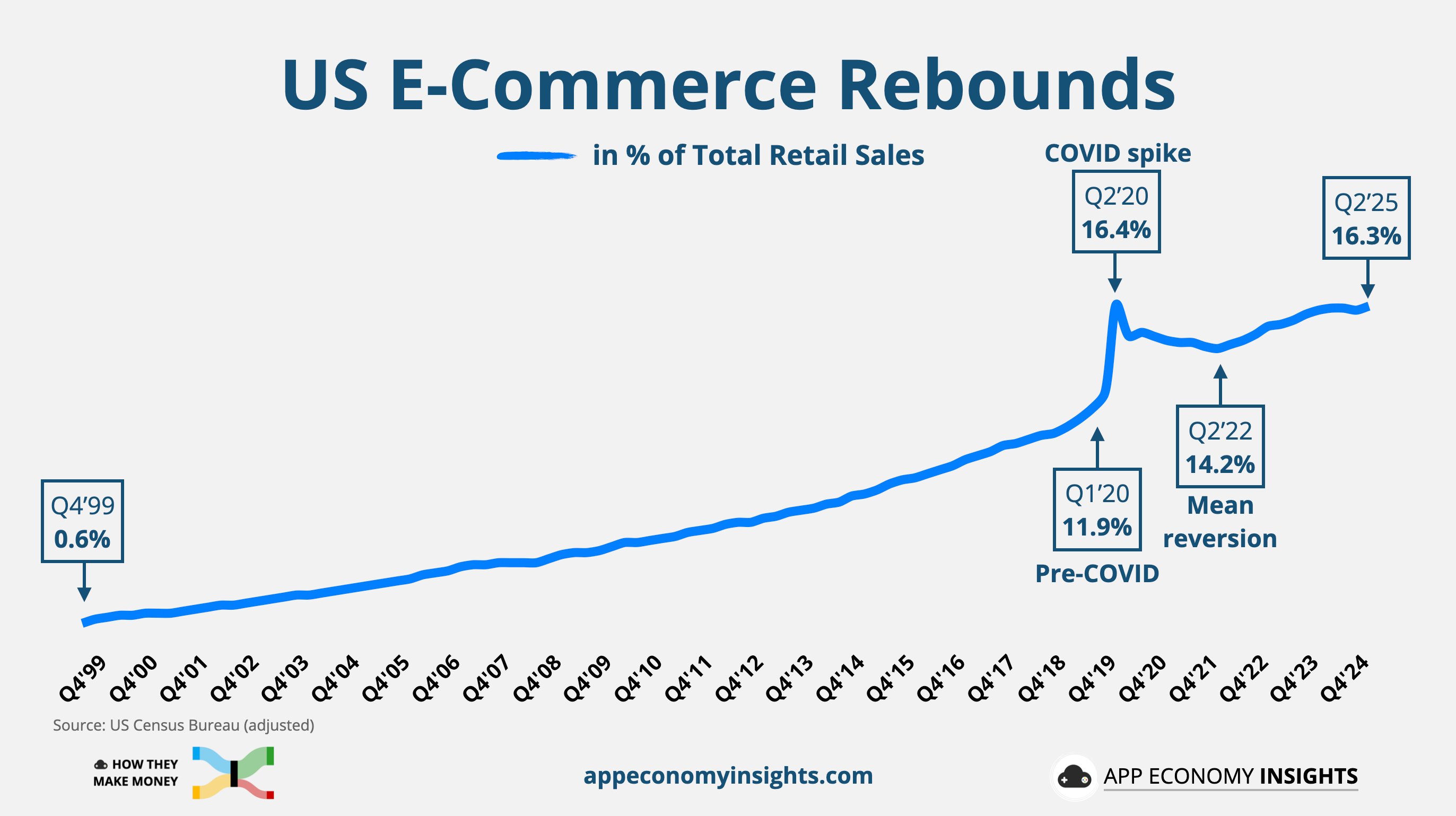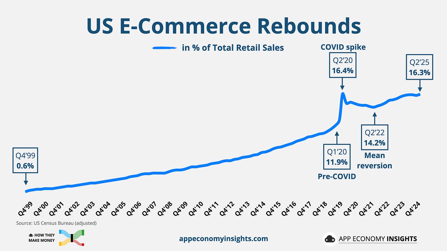 The context: In Q2 2025, US e-commerce hit $304 billion, growing 5% year-over-year. That pushes its share of total retail sales to 16.3%, nearly erasing the "mean reversion" from the last few years and closing in on the all-time high set during 2020's lockdowns. With this momentum, e-commerce could easily hit a new record this holiday season.