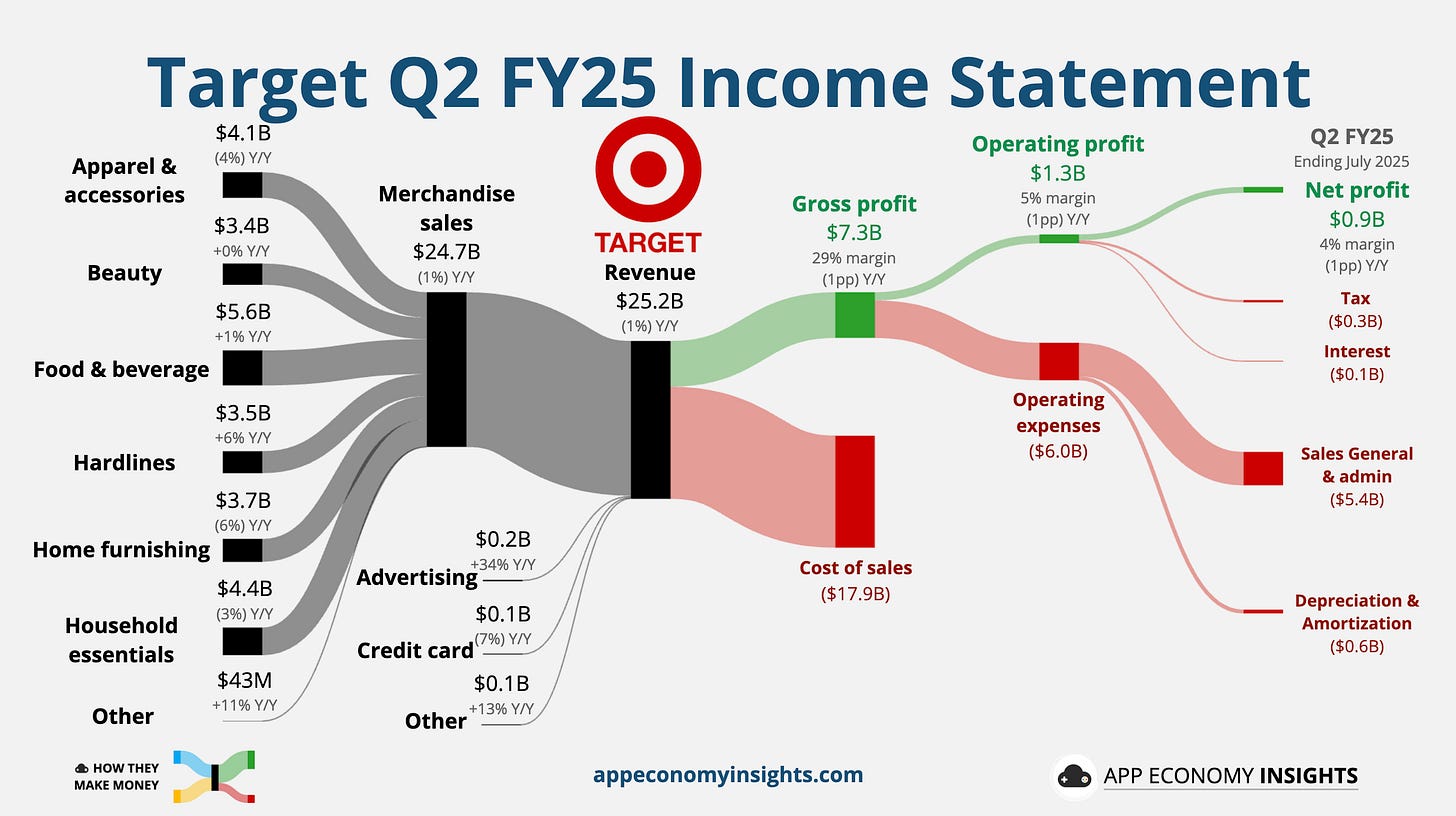 📉 Stores down but digital up: Total revenue dropped 1% Y/Y to $25.2 billion ($0.3 billion beat). Comparable sales fell 1.9%, with sales at stores down 3.2% while digital rose 4.3%. The real story, however, was that non-merchandise sales (media business, membership) rose 14%, and same-day delivery via Target Circle 360 surged more than 25%.