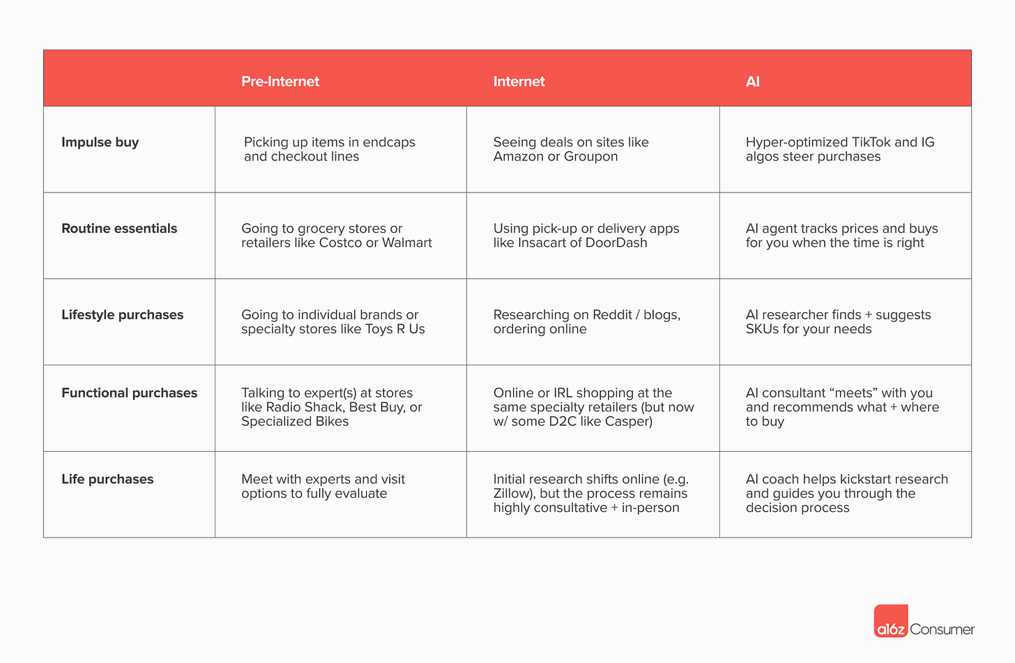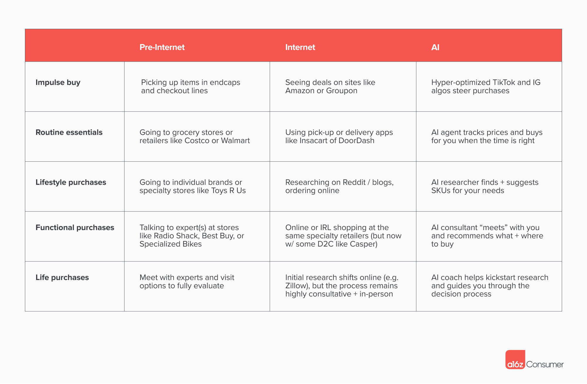 Not every purchase gets “agented” the same way. Venture firm a16z mapped buying in the AI era by level of consideration, from impulse to life decisions, offering a useful lens. We can already see it play out in hyper-optimized social feeds and personal LLMs that handle research, price-watching, and shortlists.