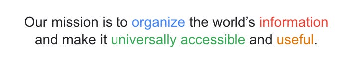 Mission: Every great company starts with a mission. Itâs the âwhyâ behind what they do. A clear mission can inspire employees, attract customers, and drive long-term success. For example, Googleâs mission is "to organize the worldâs information and make it universally accessible and useful." Simple, inspirational, and leaves room for new ventures. Ask yourself: Does the companyâs mission align with a positive secular trend or unmet need?