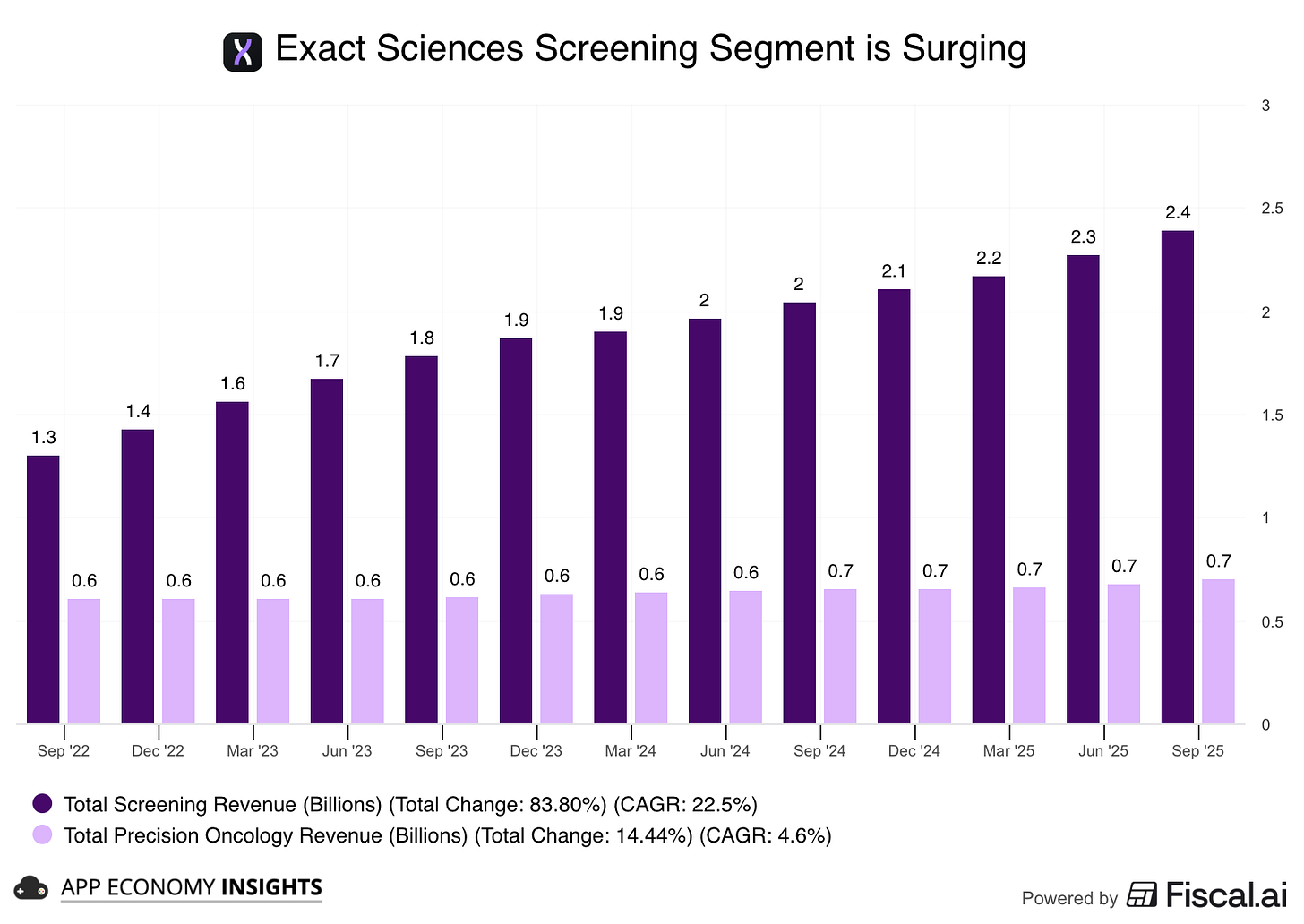 Exact Sciences isn’t a typical bolt-on. Cologuard has become one of the most successful at-home diagnostic products ever, generating over $2 billion annually, growing double digits, and backed by one of healthcare’s most reliable recurring revenue streams: screening compliance.