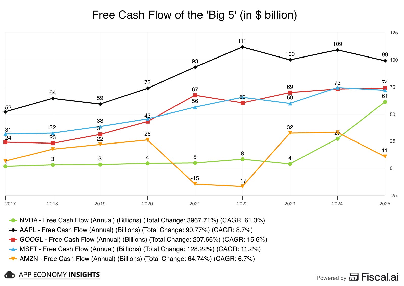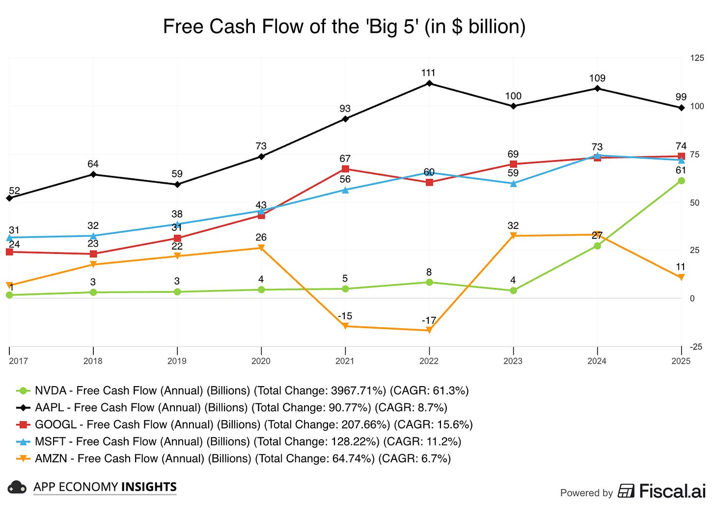 Below is a 30,000-foot view of their annual free cash flow in the past decade, with the 2025 data as of September (trailing 12 months). And remember, free cash flow is already net of CapEx, so the impact of the so-called runaway spending is already baked into these numbers.