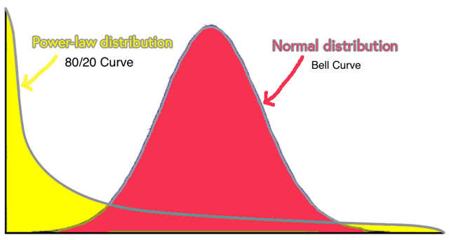 Power-law distribution: Recognized as the 80/20 Curve or Pareto Principle, this distribution sees a small number of occurrences having a significant impact. Think of it like viral videos: a few garner millions of views while countless others remain unseen.