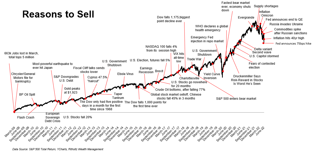 The news cycle is always about a potential recession, a bear market, or a bubble ready to burst. I love this illustration that shows the many reasons to sell. It’s a great reminder that time in the market trumps timing the market.