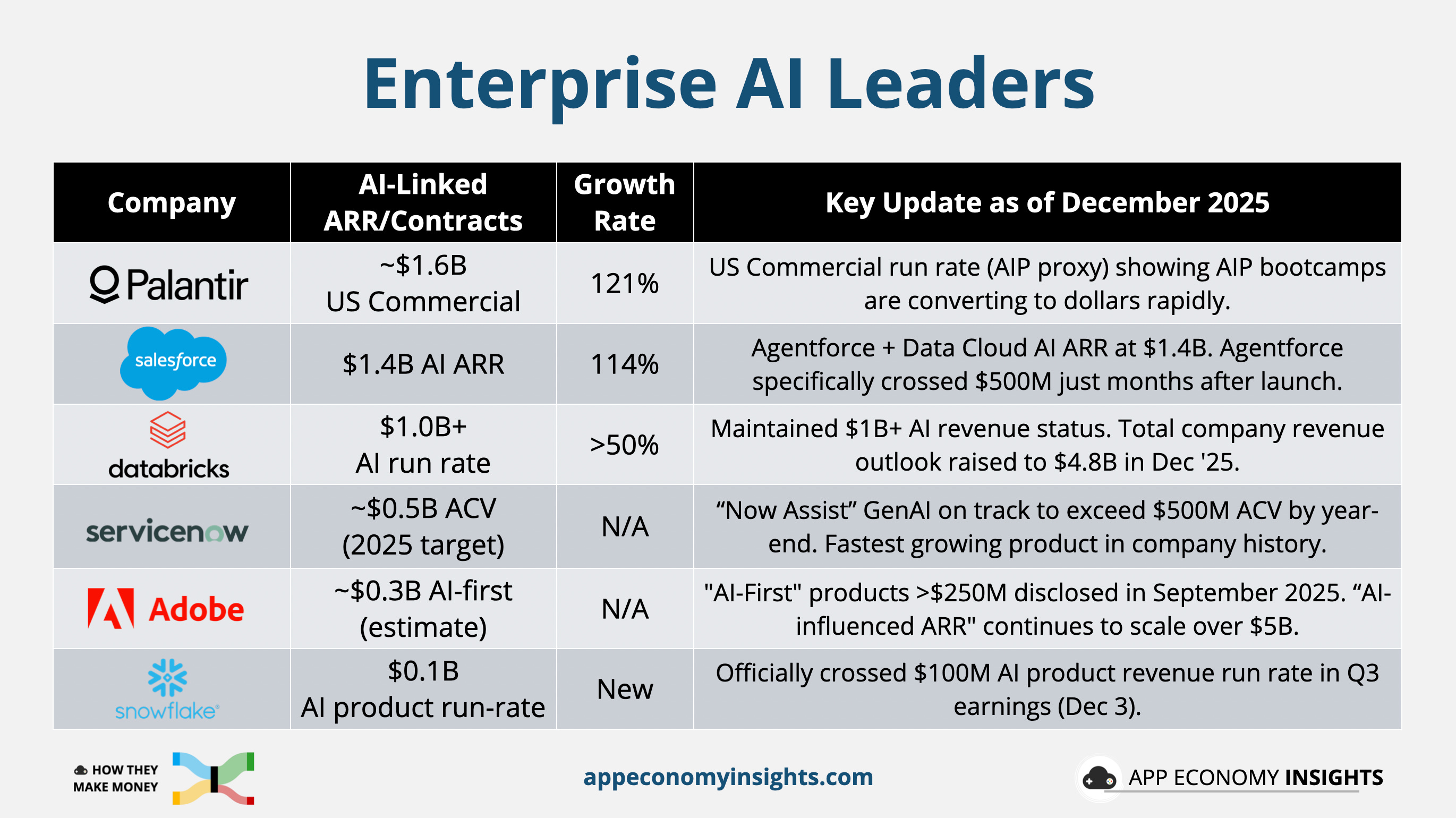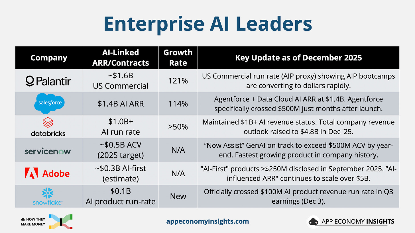 Palantir ($1.6 billion US Commercial run rate): The standout performer. Their AIP Bootcamps strategy has successfully converted pilot programs into committed revenue, driving US Commercial growth to 121%.