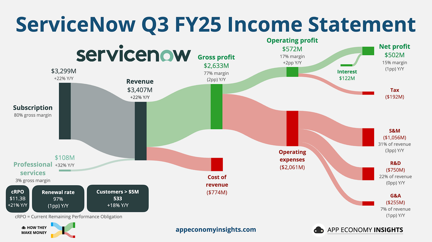 ServiceNow delivered another stellar quarter, with Q3 revenue rising 22% Y/Y to $3.4 billion ($50 million beat) and adjusted EPS soaring 30% Y/Y to $4.82 ($0.55 beat). The outperformance was driven by accelerating AI adoption and strong enterprise demand. Subscription revenue grew 22% to $3.3 billion, and cRPO climbed 21% to $11.3 billion. Large customer momentum continued, with customers spending over $5 million in ACV growing 18% Y/Y to 553.