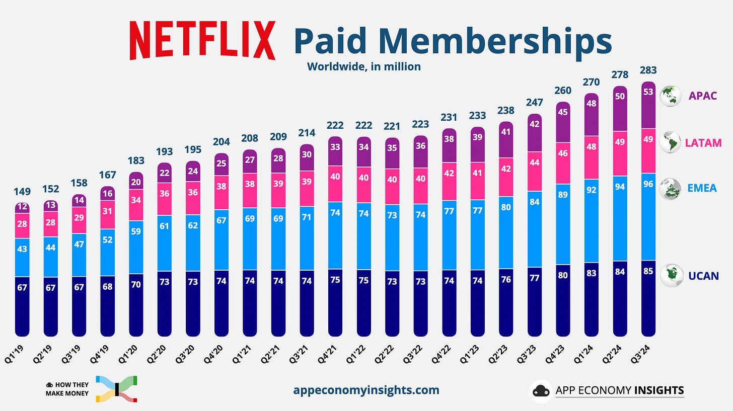 283 million paid memberships at the end of Q3 FY24 (+14% Y/Y).
