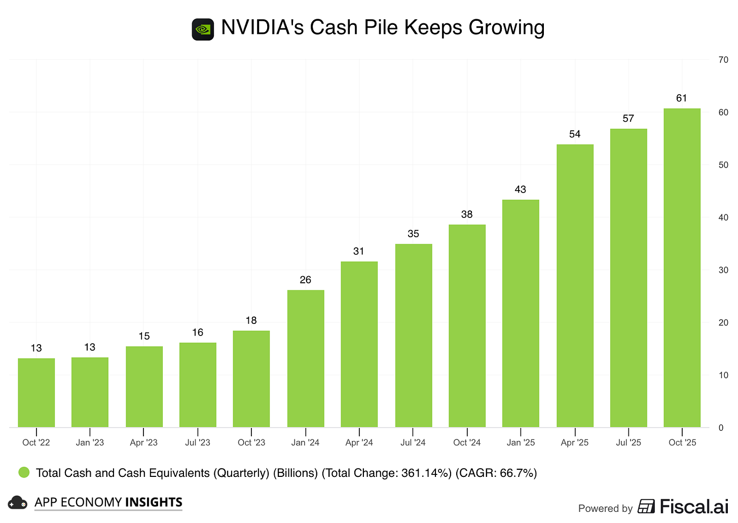 NVIDIA now has a Berkshire-style challenge to put its money to work. With a fast-growing pile of $61 billion in cash, the company is investing in the most important players in AI to secure future offtake and expand the CUDA ecosystem. These deals ensure that the fastest-growing AI companies have the resources to scale, which reinforces NVIDIA’s long-term demand rather than propping it up.