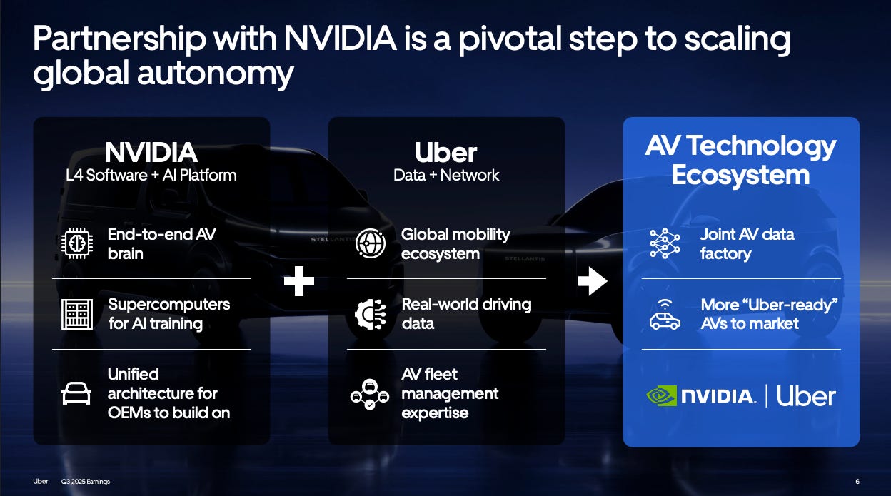 NVIDIA will supply the âL4 brainâ and AI training computers. Uber brings the global ride-and-delivery network, driving data, and fleet-management infrastructure. Together, theyâre building an AV Technology Ecosystem to bring âUber-readyâ autonomous vehicles to market. Itâs the next step in Uberâs quiet AV expansion, already spanning 20+ partners. You can already order a Waymo on Uber in cities like Atlanta and Austin.