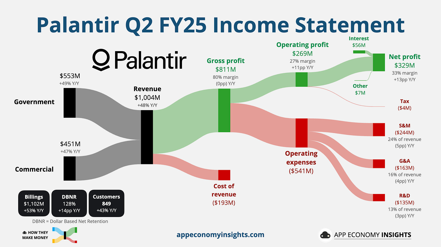 Palantir smashed expectations again, crossing $1 billion in quarterly revenue for the first time, up 48% Y/Y and $61 million ahead of estimates. Total US revenue grew 68% to $733 million, cementing the US as Palantir’s growth engine. US commercial sales surged 93% to $306 million, while US government revenue climbed 53% to $426 million.