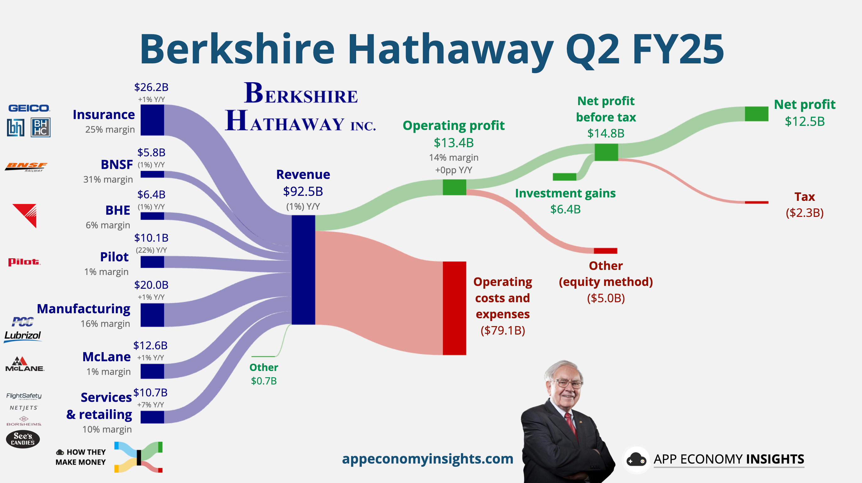 Revenue slipped 1% Y/Y to $92.5 billion with a relatively flat operating profit as wildfire losses in its insurance arm wiped out gains at BNSF and Berkshire Energy. Net profit plunged versus last year, driven by smaller investment gains and the write-downs.