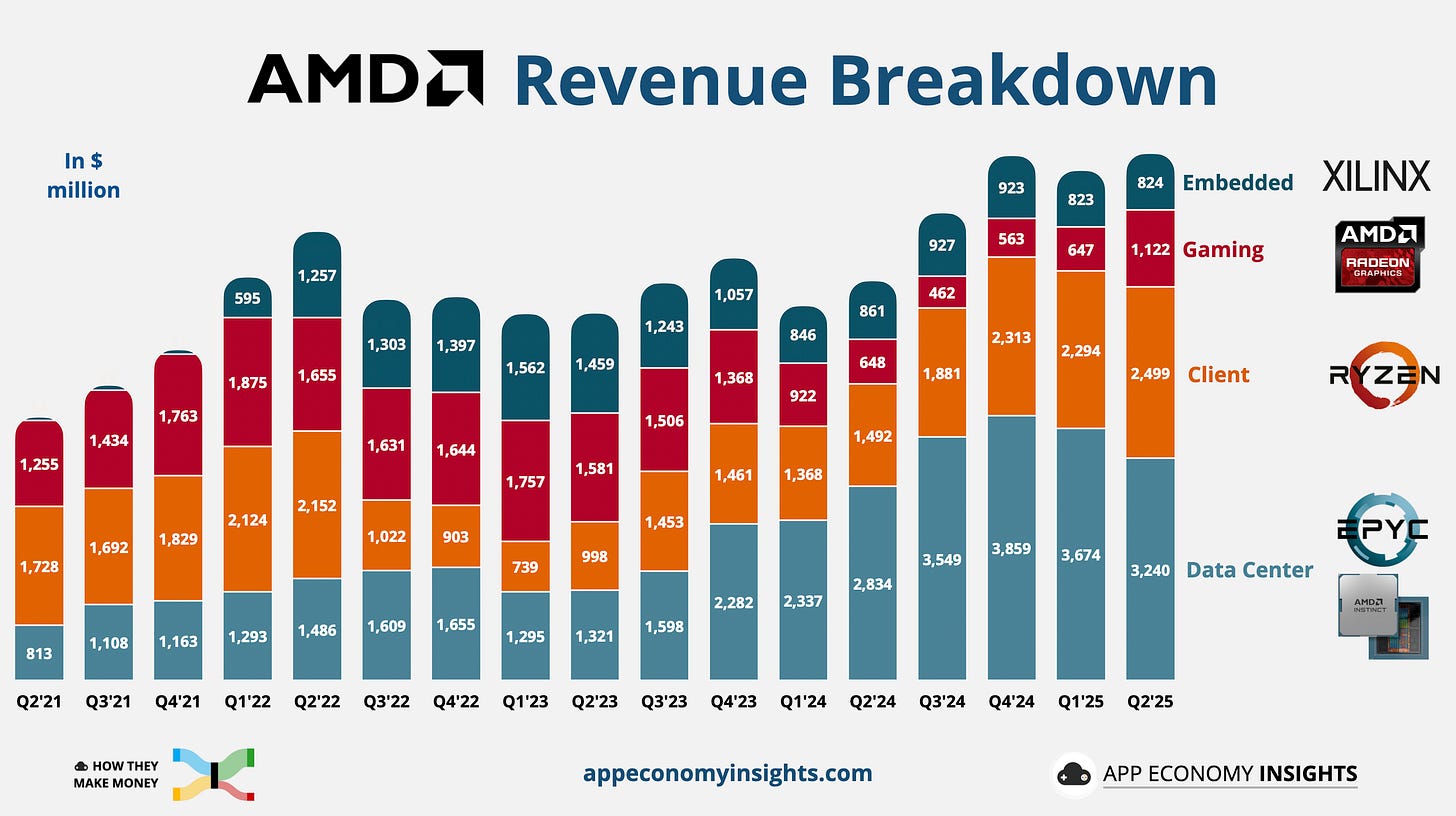 Client revenue jumped 67% Y/Y to $2.5 billion, driven by strong uptake of Ryzen 8000 and Zen 5 desktop CPUs as AMD gained share from Intel. AI‑capable laptops also boosted sales, reflecting a broader PC refresh cycle. Gaming revenue surged 73% to $1.1 billion on higher semi‑custom chip shipments for PlayStation and XBOX consoles and steady GPU demand, aided by AI‑accelerated features.