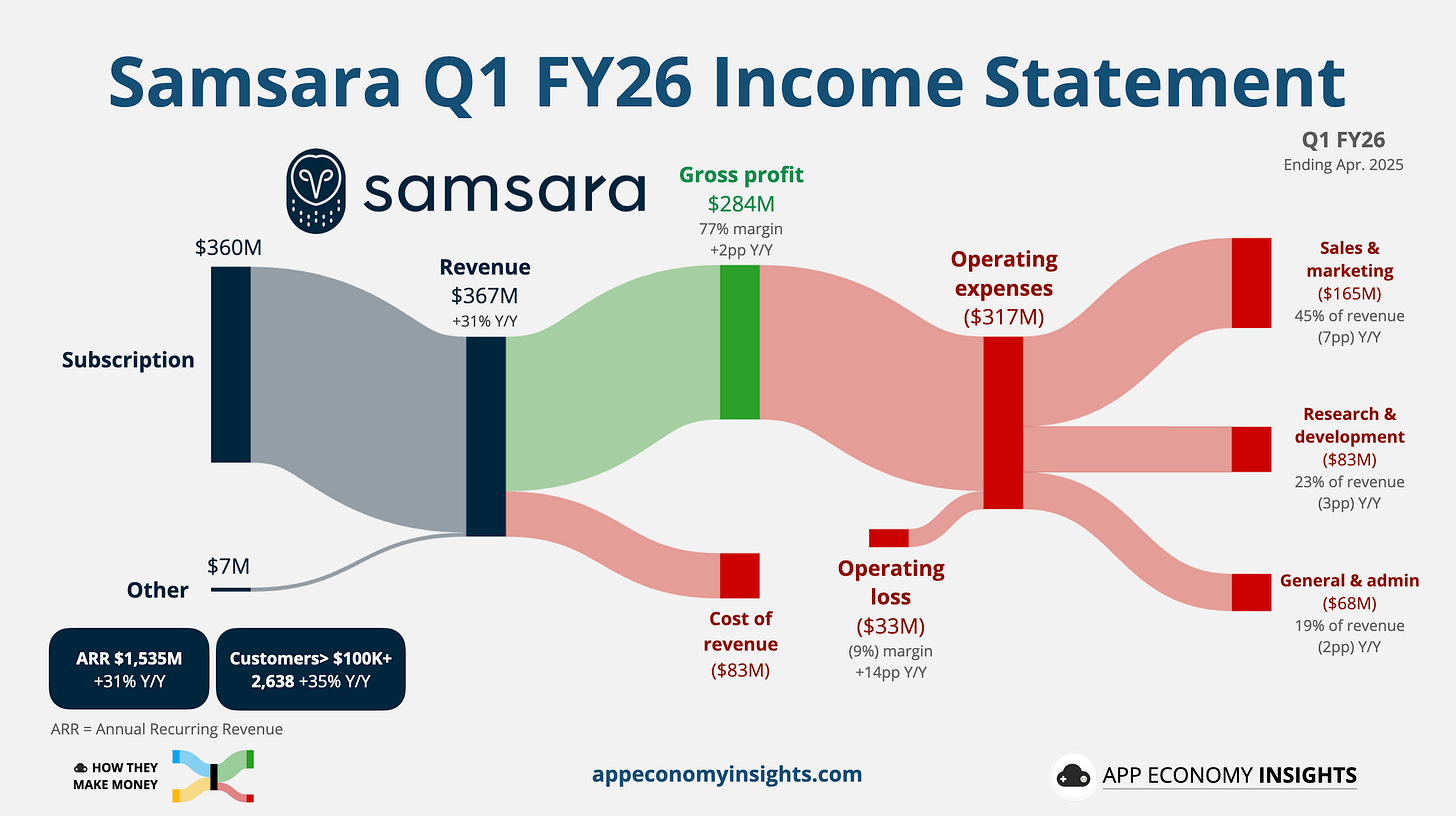 Samsara kicked off FY26 with a 31% Y/Y jump in revenue to $367 million ($15 million beat) and adjusted EPS of $0.11 (beating by $0.05). ARR reached $1.54 billion, up 31% Y/Y, with large customers ($100K+ ARR) rising 35% to 2,638. Gross margin reached a record 77%, and the operating loss margin improved to 9% (from 24% last year), indicating improving efficiency. AI-powered safety tools and major OEM integrations with Stellantis, Rivian, and Hyundai Translead reinforced Samsara’s strategy of embedding deeper into customer operations.