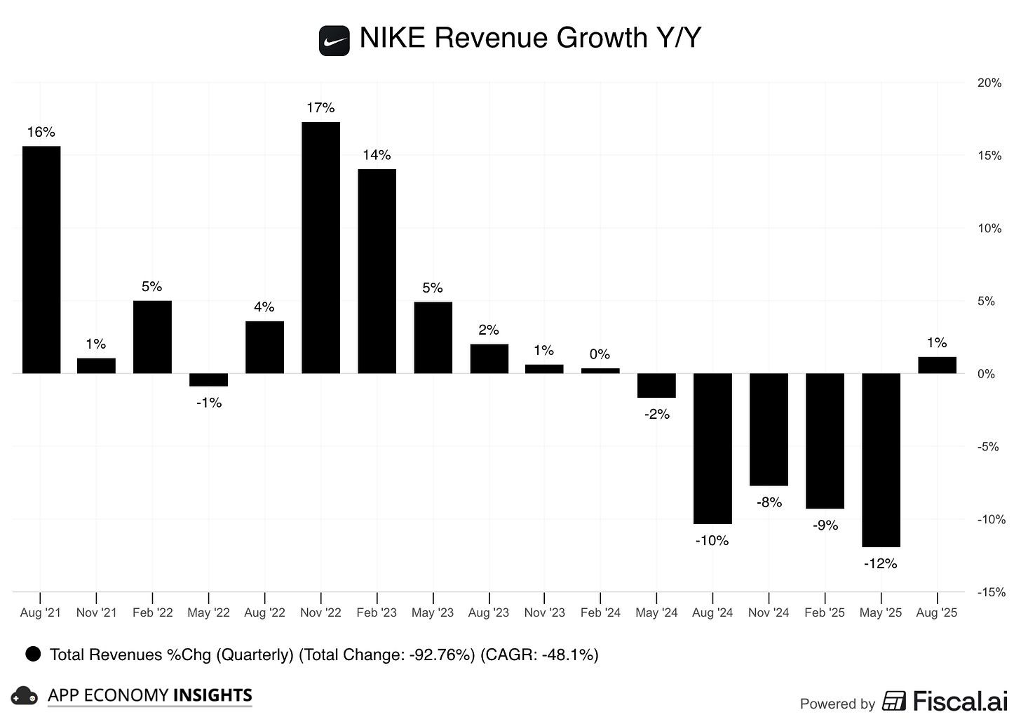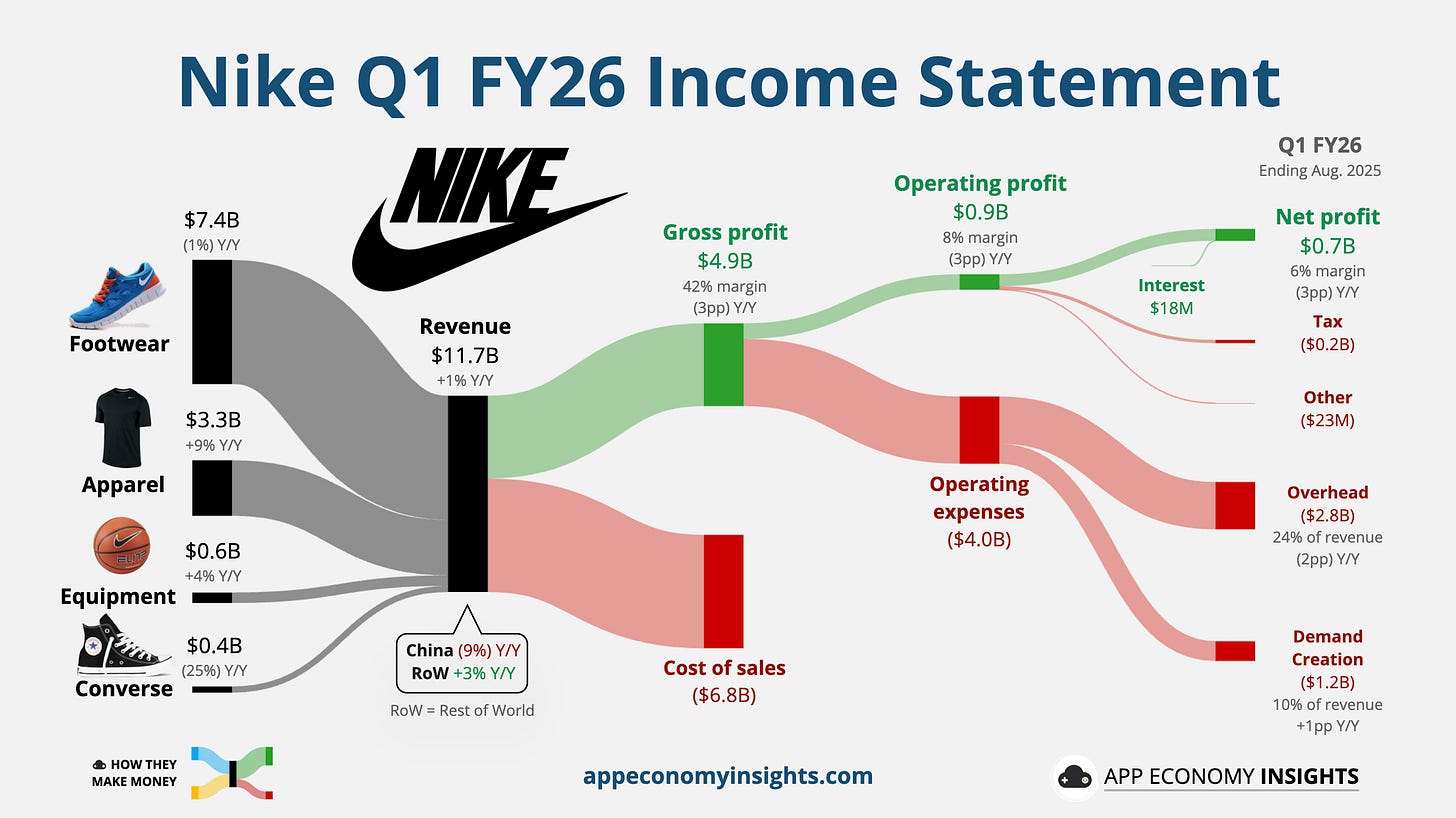 Nike’s turnaround showed its first tangible signs of success in its Q1 FY26 (August quarter), with revenue returning to growth, up 1% Y/Y to $11.7 billion (a massive $710 million beat). It was the first quarter of positive growth since February 2024.