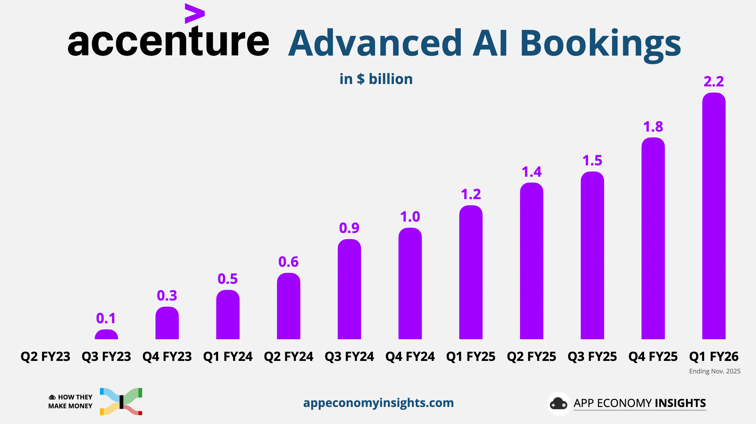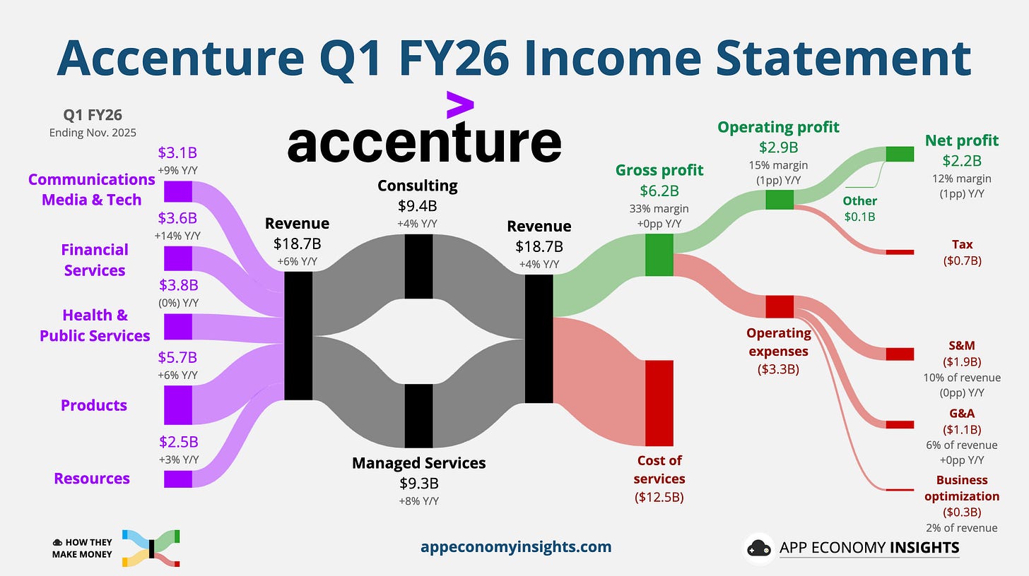 Accenture kicked off FY26 with Q1 revenue (November quarter) rising 6% Y/Y to $18.7 billion ($0.2 billion beat) and non-GAAP EPS of $3.94 ($0.22 beat).