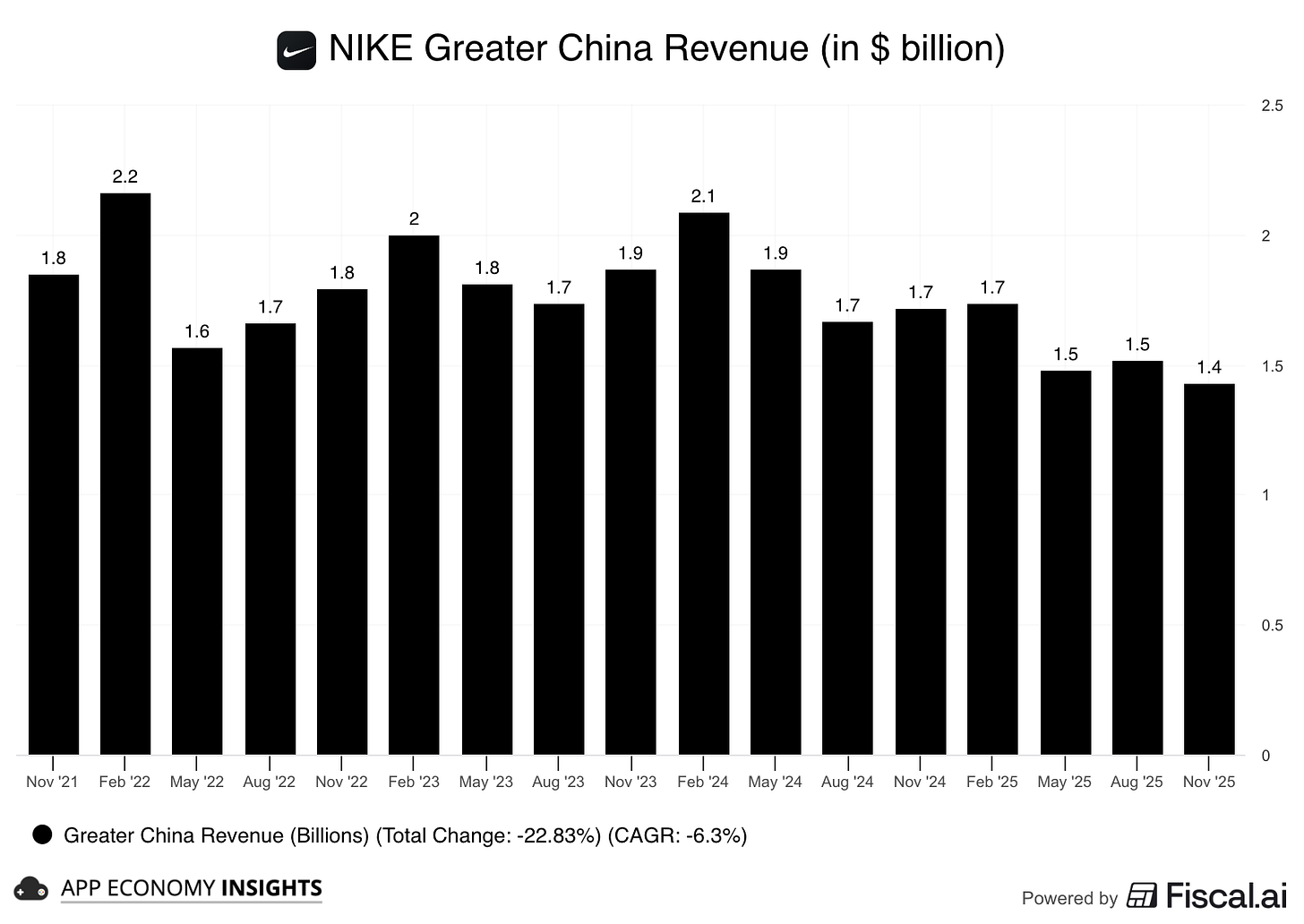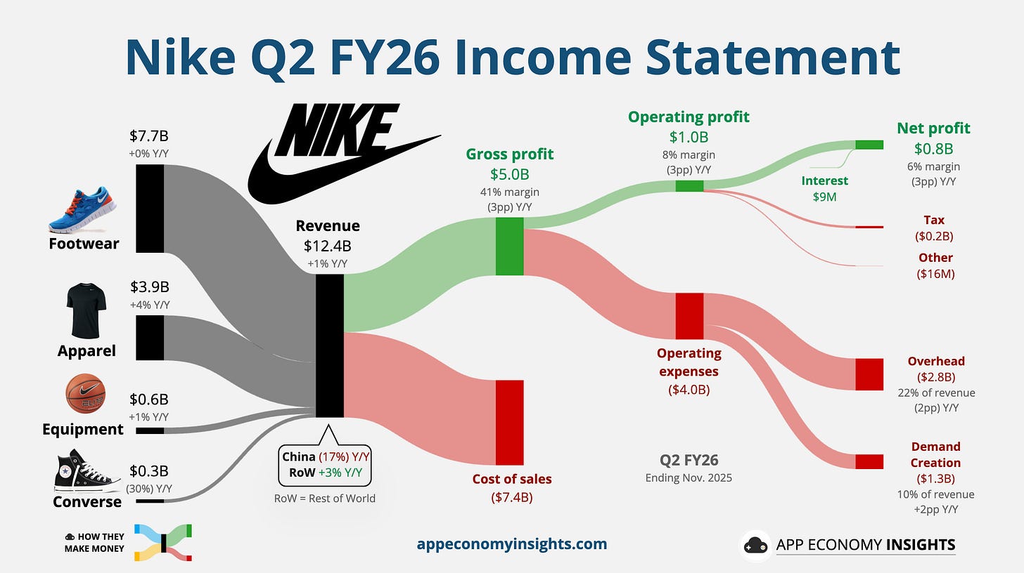 Nike’s Q2 FY26 revenue managed to stay positive, growing 1% Y/Y to $12.4 billion ($0.2 billion beat), while EPS declined 32% Y/Y to $0.53 ($0.16 beat).