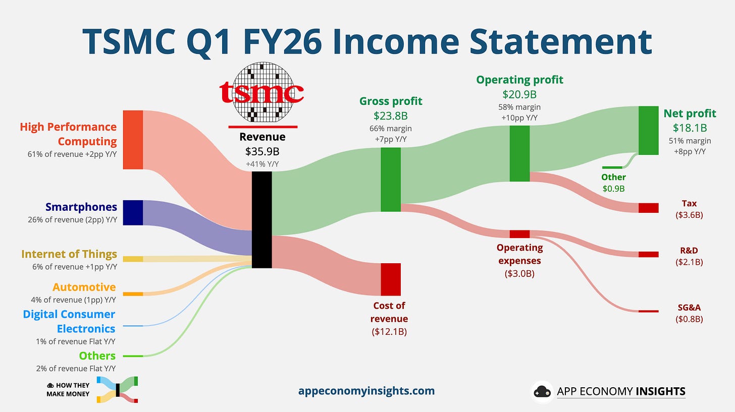 TSMC’s Q1 FY26 results reflected a massive transition, as demand for AI infrastructure moved from speculation to concrete financial gains. Revenue skyrocketed 41% Y/Y to $35.9 billion ($0.4 billion beat), while net income surged 58%. Management raised its full-year 2026 revenue growth forecast to above 30%, up from the previous ~30% target.