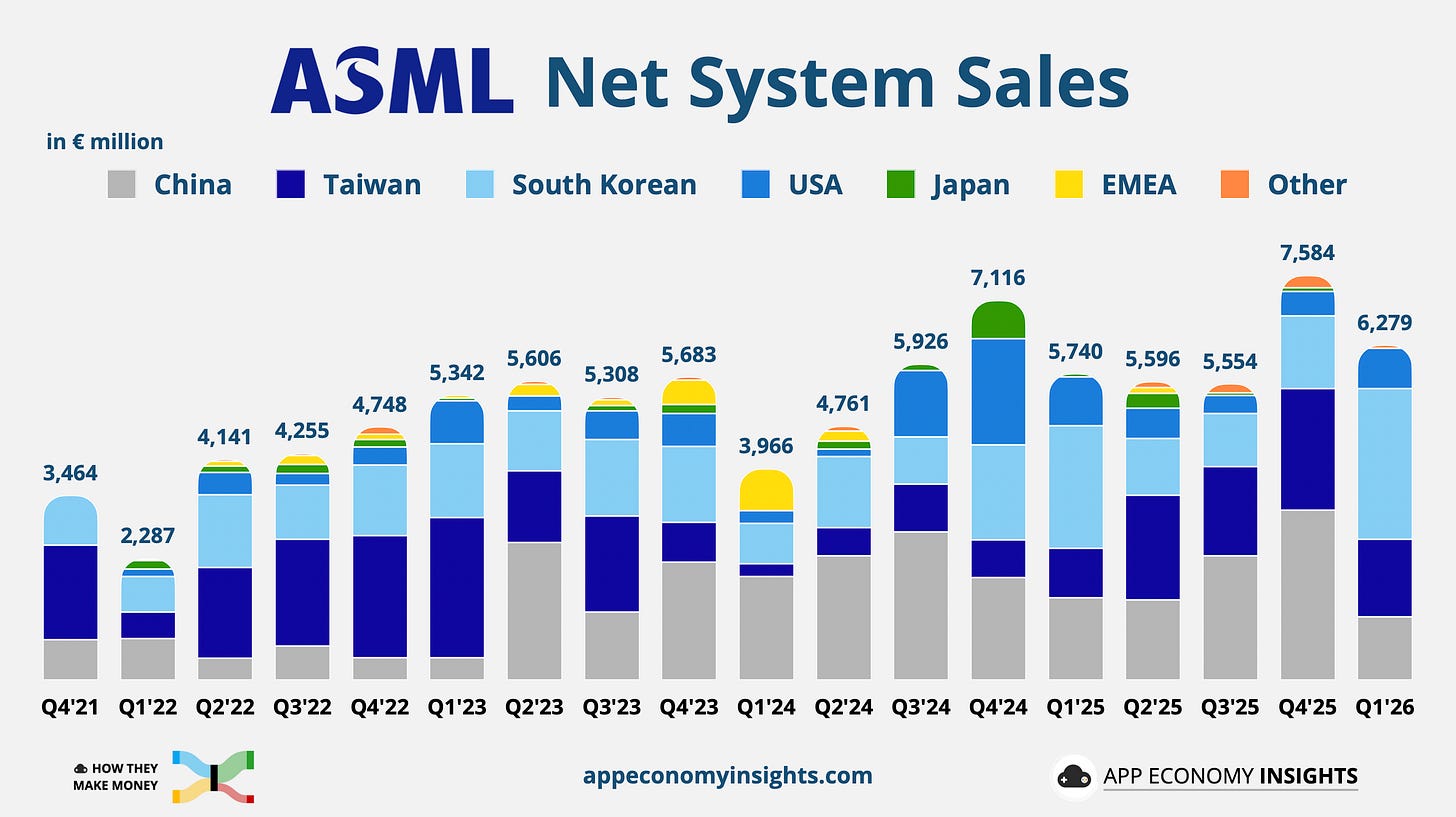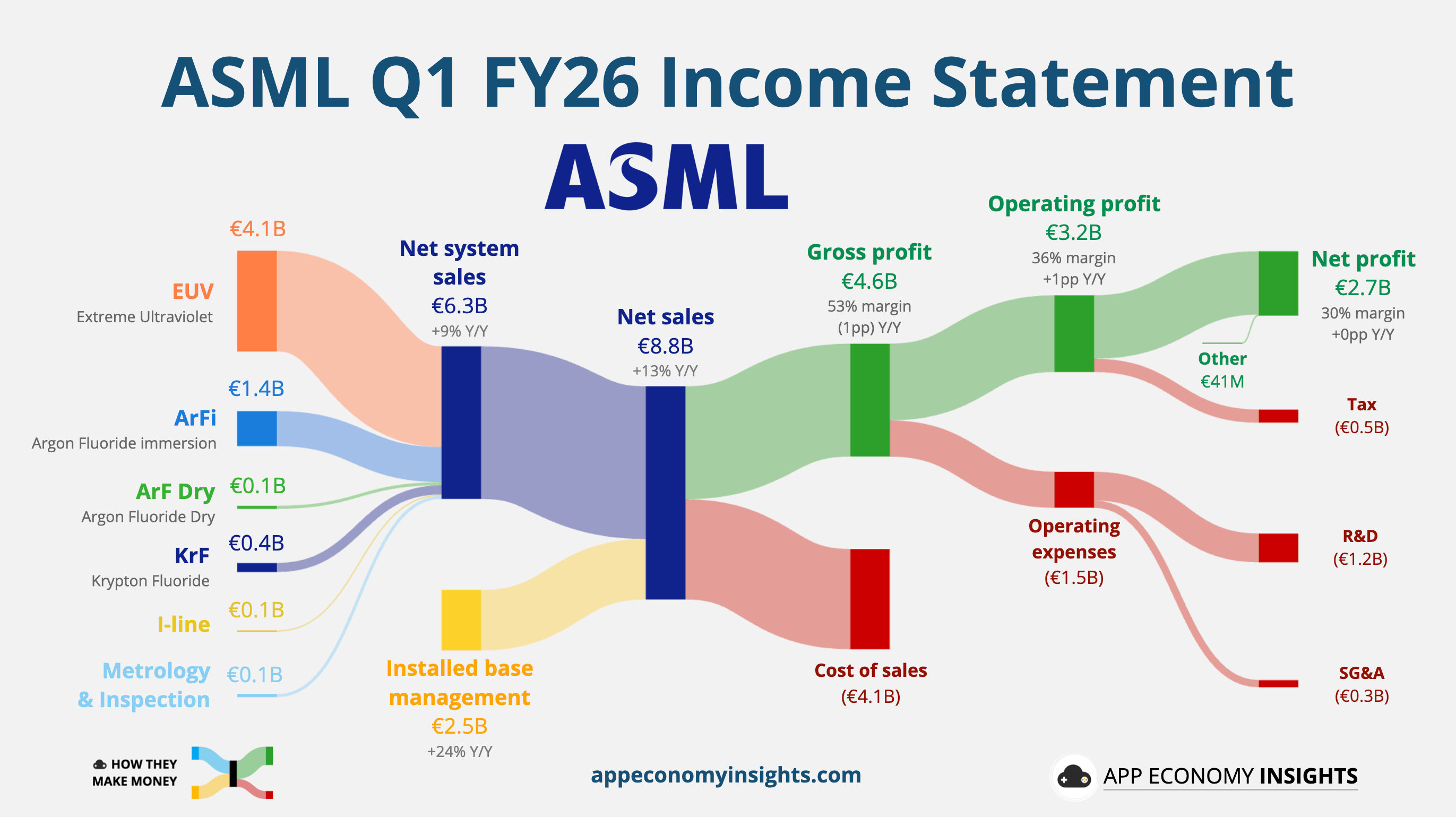 ASML kicked off Q1 2026 with a solid beat, proving that the semiconductor industry’s lithography intensity is only increasing. Revenue rose 13% Y/Y to €8.8 billion (€110 million beat), while GAAP EPS of €7.15 comfortably topped estimates. Citing an insatiable appetite for AI infrastructure, management raised and narrowed its full-year 2026 sales guidance to €36-€40 billion (an improvement from €34-€39 billion previously).