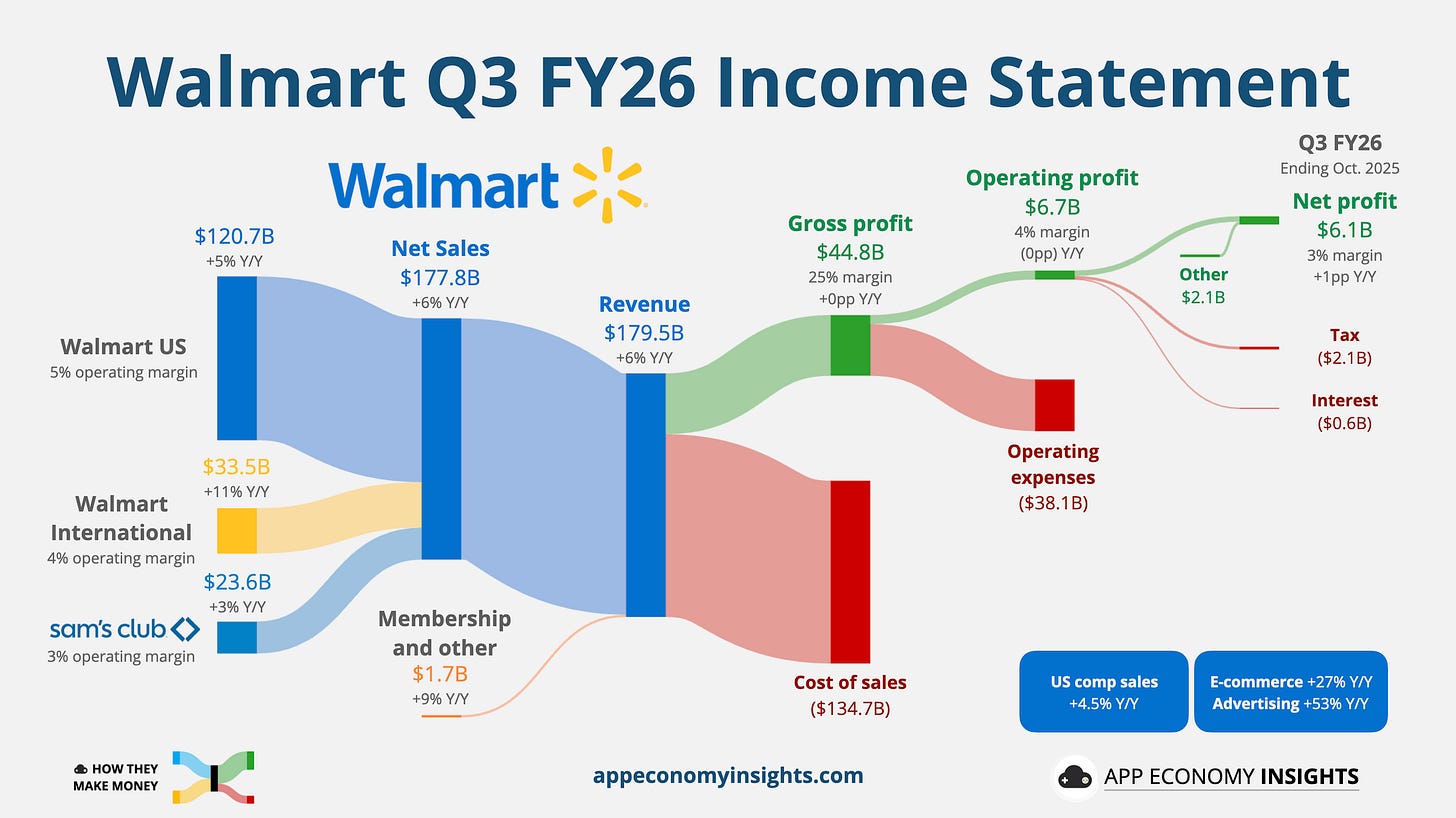 Walmart sales grew 6% Y/Y to $179.5 billion ($4.3 billion beat) and GAAP EPS of $0.62 ($0.02 beat) for its October quarter (Q3 FY26).