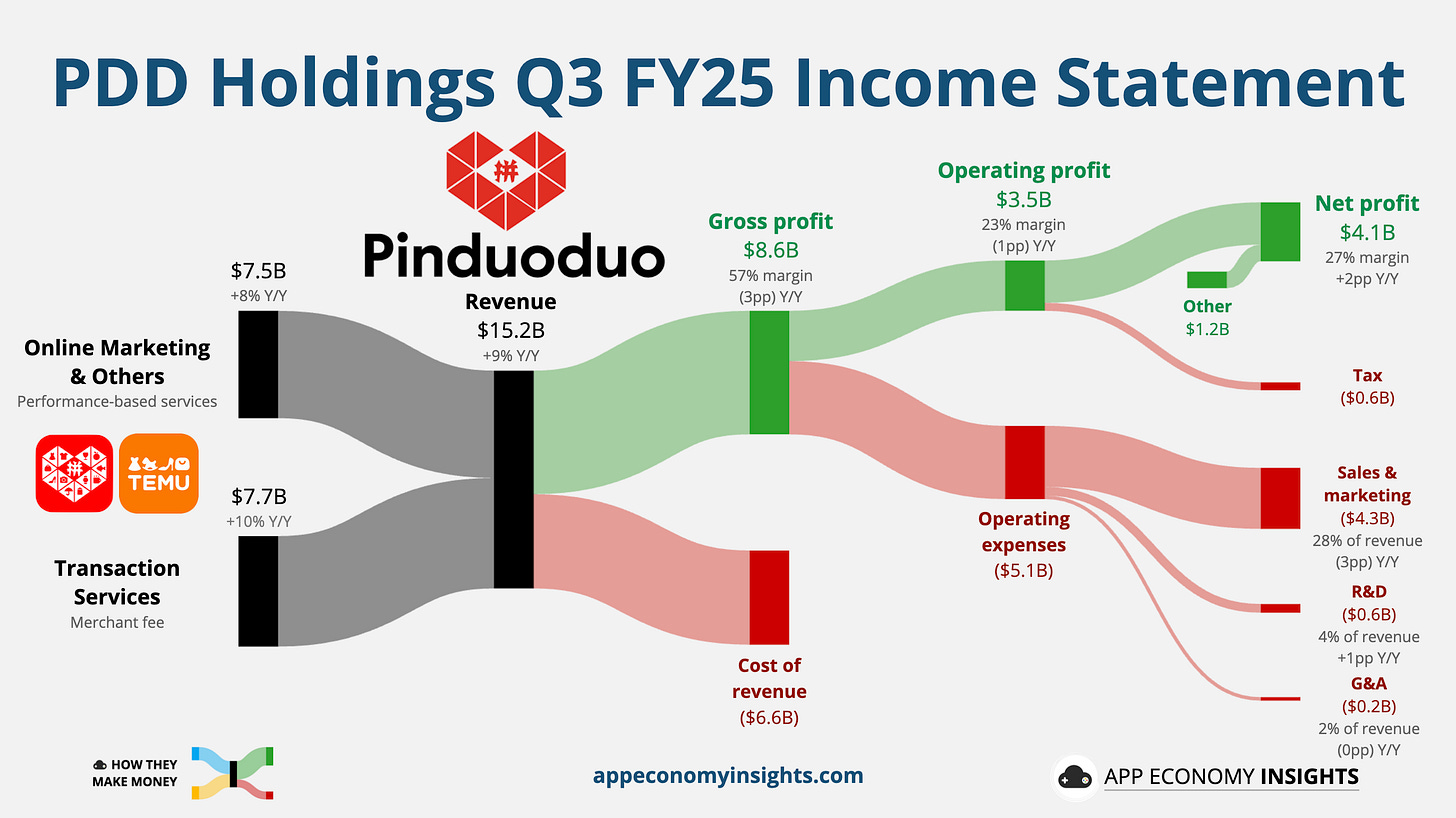 Temu’s parent, PDD Holdings, saw Q3 revenue rise 9% Y/Y to $15.2 billion ($90 million miss), continuing its slow pace amid a tough consumer environment in China. Looking at the growth by segment, Online Marketing Services (performance-based) grew 8% and Transaction Services (including merchant fees) rose 10%.