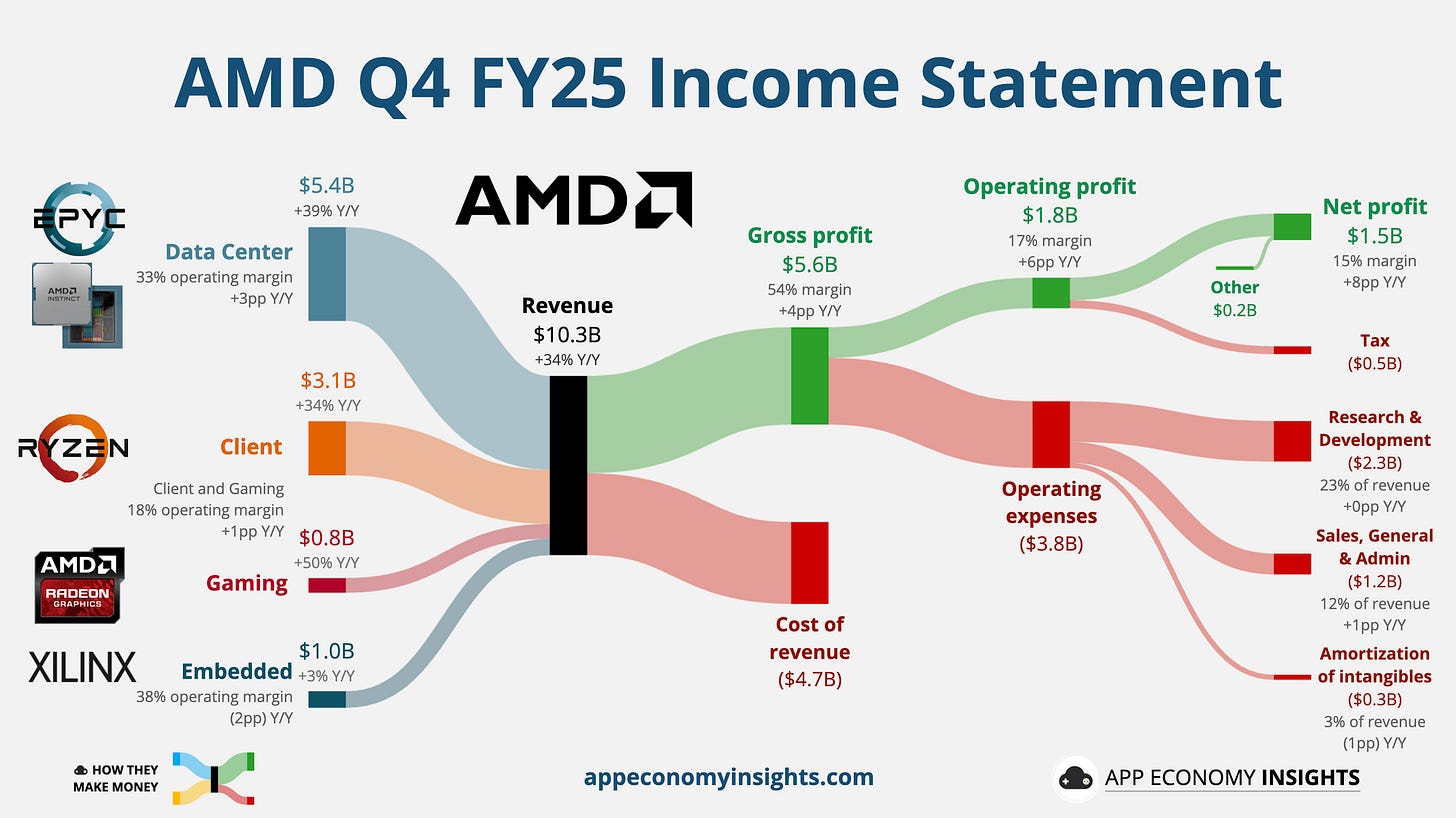 AMD delivered Q4 revenue growth of 34% Y/Y to $10.3 billion ($630 million beat) and adjusted EPS of $1.53 ($0.21 beat).