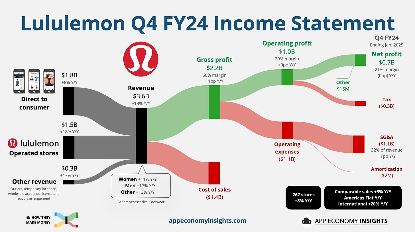 Lululemon closed FY24 with a 13% jump in Q4 revenue to $3.6 billion ($30 million beat) and EPS of $6.14 ($0.27 beat). Gross margin expanded 100 basis points to 60%. International revenue surged 38% Y/Y, much faster than the 7% Y/Y in the Americas. Comparable sales up 3%—driven by 20% growth abroad, including 27% in mainland China. Meanwhile, sales in the Americas were flat. The company ended the quarter with 767 stores, adding 18 net new locations.