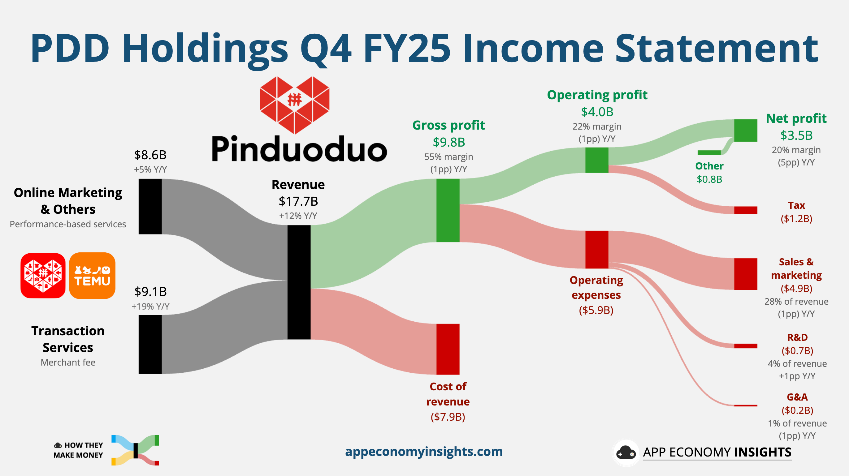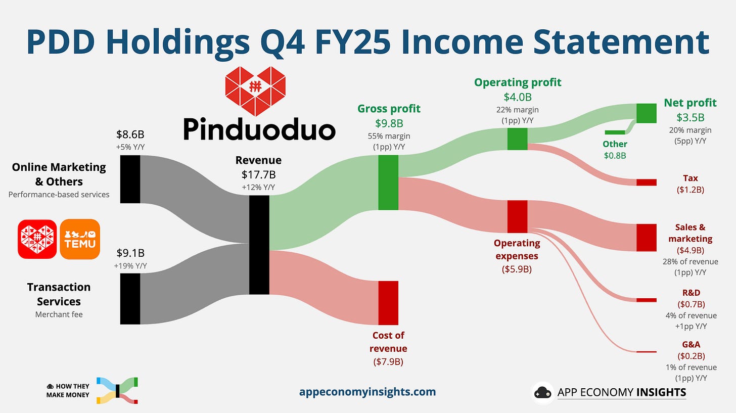 Temu parent PDD Holdings capped off FY25 with Q4 revenue rising grew 12% Y/Y to $17.7 billion ($0.4 billion miss), an acceleration from the single-digit growth seen earlier in the year.