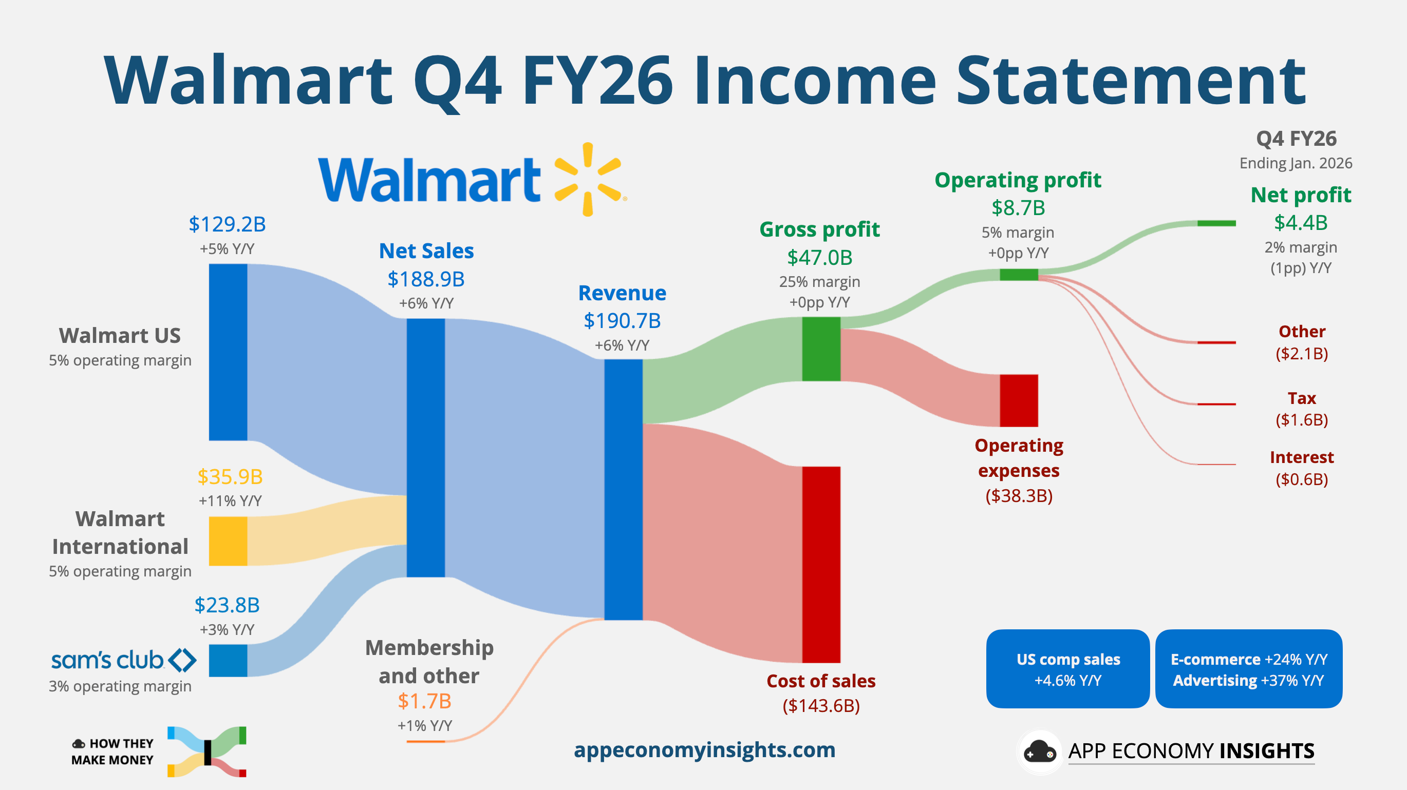 Walmart just reported its January quarter (Q4 FY26), and revenue grew 6% Y/Y to $190.7 billion ($2.4 billion beat). Adjusted EPS narrowly topped expectations, marking a resilient holiday season despite a compressed shopping window.