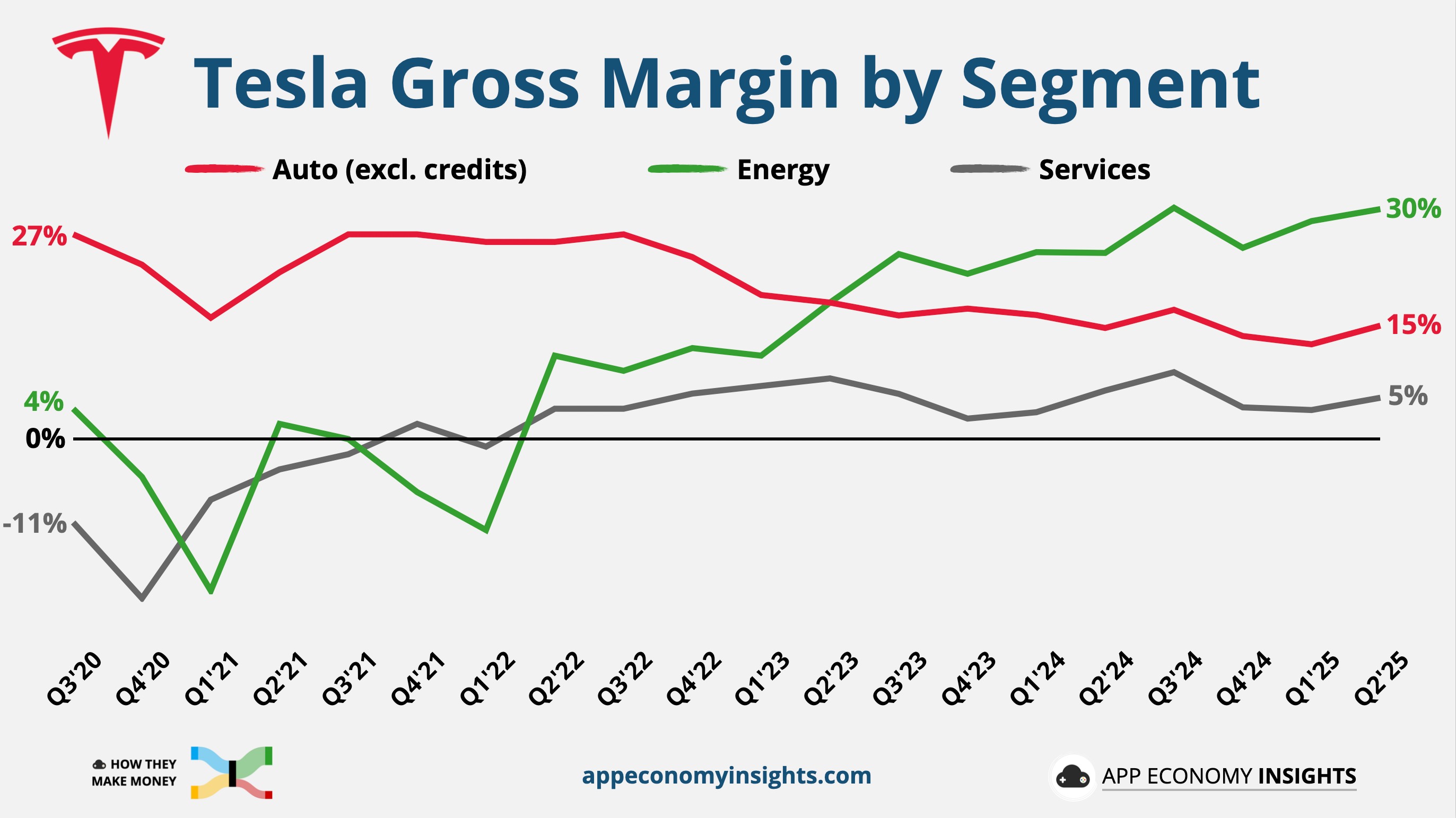 Auto revenue fell 16% Y/Y while the non-auto segments were up 4%, partially offsetting the decline. Energy alone is now 22% of Tesla’s gross profit.