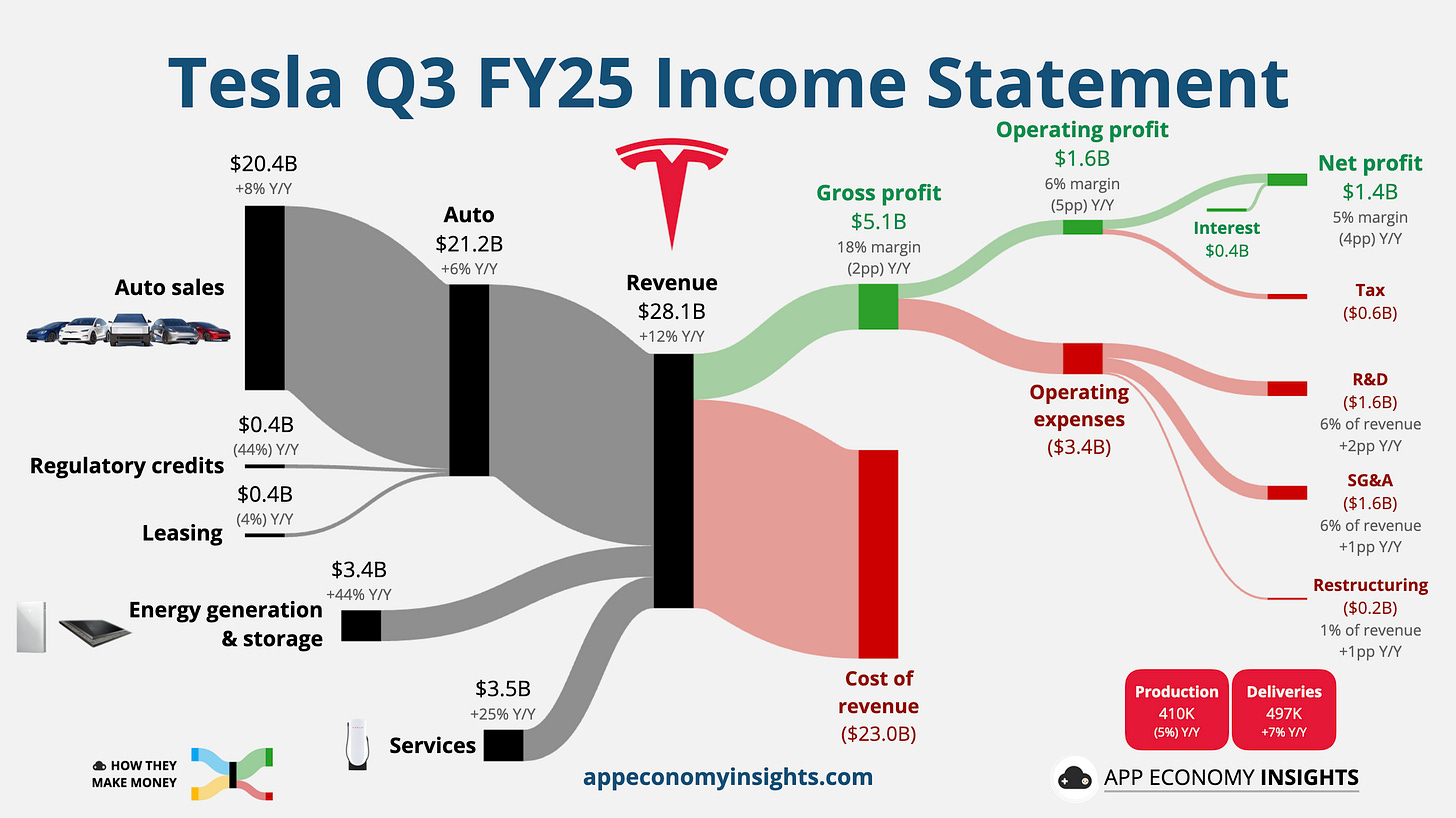 🚗 Automotive: Revenue from selling EVs (75% of revenue). Deliveries rose 7% Y/Y to 497K vehicles, while production fell 5% to 410K, suggesting Tesla is tapping into existing inventory amid uneven demand.