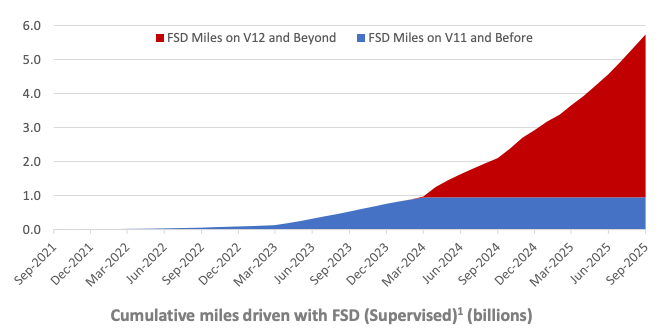 🤖 FSD: Tesla’s fleet has now logged 6 billion miles using FSD (Supervised), strengthening the data-advantage thesis. That said, true unsupervised deployment remains elusive, and generating revenue from it is still a way off. So, the promise stays intact, but the clock keeps ticking.