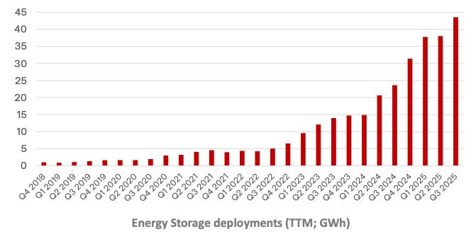 🔋 Energy & storage scaling but still lumpy: Deployments hit new highs (>12.5 GWh in Q3), but the high-margin boost remains inconsistent and timing-sensitive. Musk teased Megapack 4, which could output at 35 kV and serve directly as substation infrastructure, a timely feature as the global grid becomes the new bottleneck for AI expansion.
